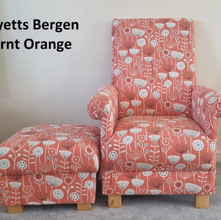 I am offering for sale this gorgeous ADULT'S chair, which has been made myself. I am a professional upholsterer with over 33 years experience, and have made this sturdy little chair and matching footstool, using Fryetts Bergen Burnt Orange fabric.