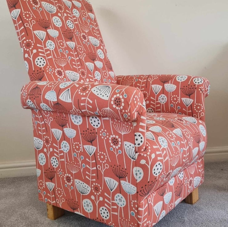 This lovely adult's armchair measures approximately 38 inches in height, by 26 inches wide and will look gorgeous in any room, and is a real accent piece of furniture. It has a wooden frame and has a fire retardant interliner, which makes it compliant with UK fire regulations. It is then upholstered entirely with this gorgeous fabric, and has solid wooden feet.