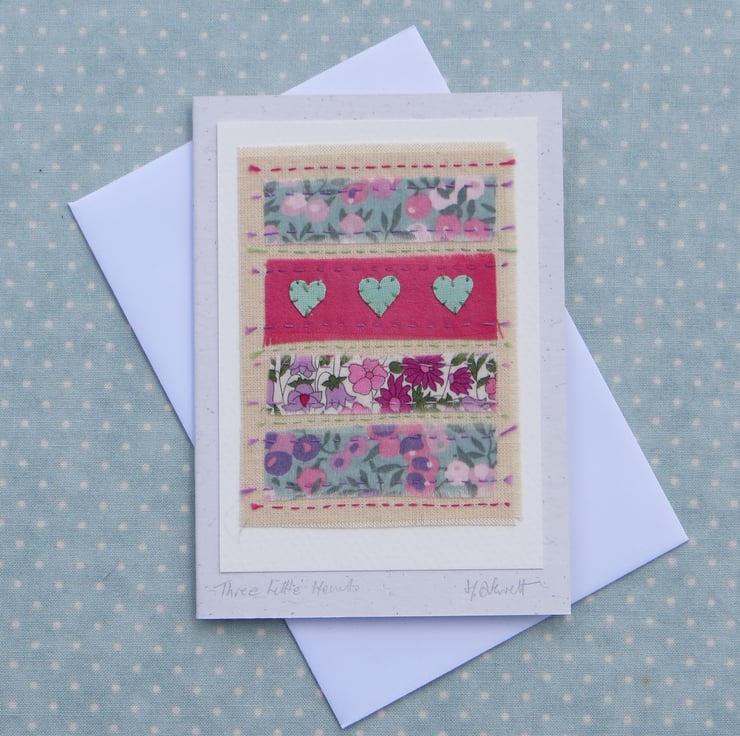 The cards measure 12 x 9 cm and come with matching coloured recycled paper envelopes in clear protective cellophane sleeves. Each card is signed on the front and my studio stamp is on the back. Cards are made from stout 100% recycled card - blank inside. The title is written below the textile: 'Three Little Hearts'.