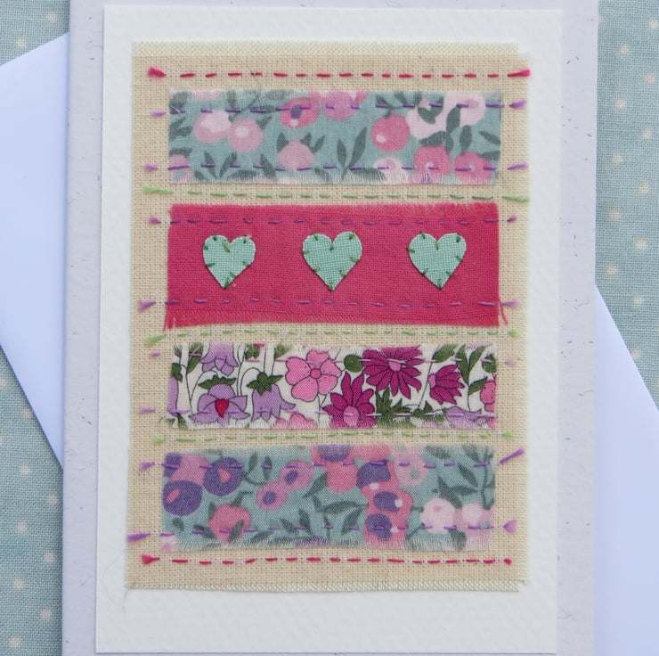 Pretty hand-stitched card with hand dyed/recycled cotton applique and Liberty tana lawn fabrics. Very fine and delicate, perfect for any time when you want to send your love to someone in a special way.