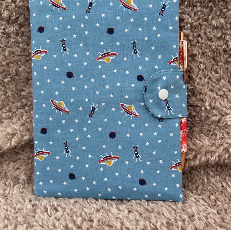 The external uses a retro style UFO theme on a denim blue background, and the inner sleeve has a white on grey polka dot.