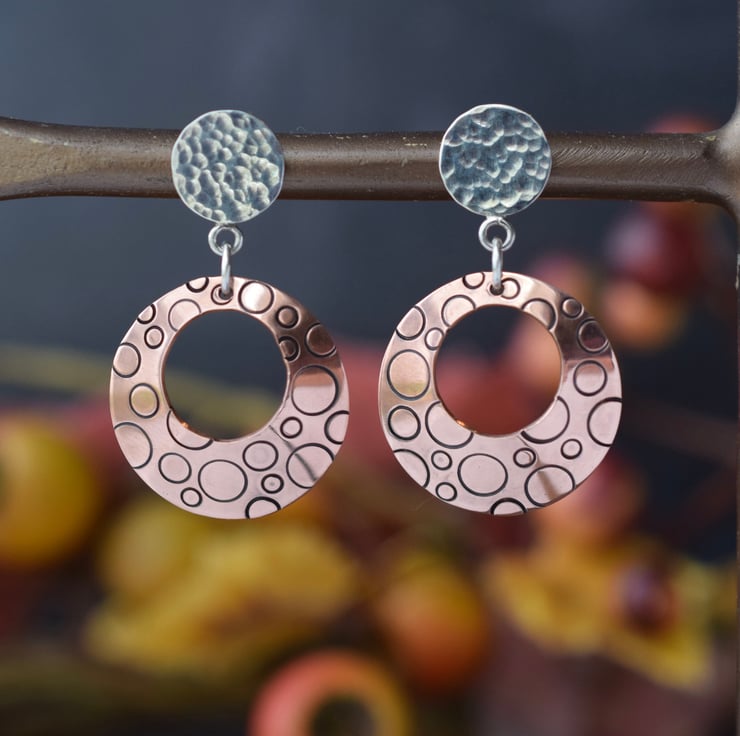 Designed and crafted by Isobel Robinson, these elegant circle earrings feature a hand textured design which is unique to each piece. The design uses a mix of sterling silver and copper for added interest and versatility to wear through all seasons.