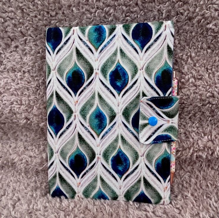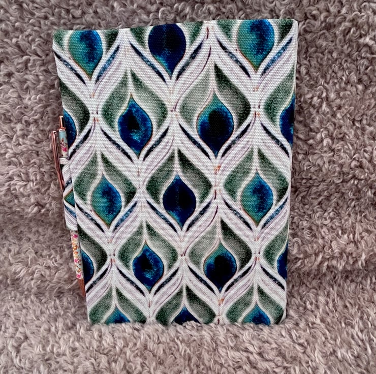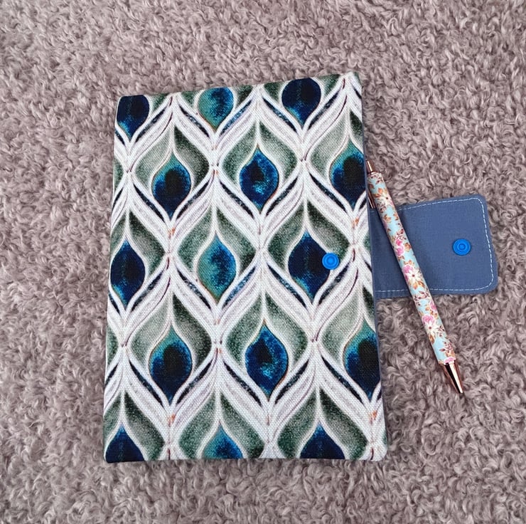 The external print features peacock feathers, while the inner sleeve is crafted from plain mid-blue cotton.