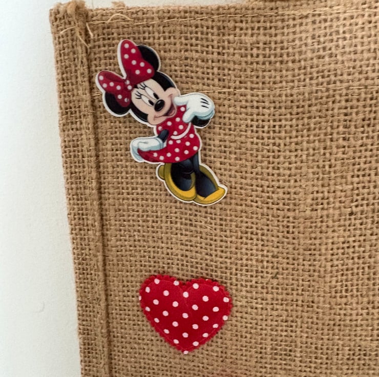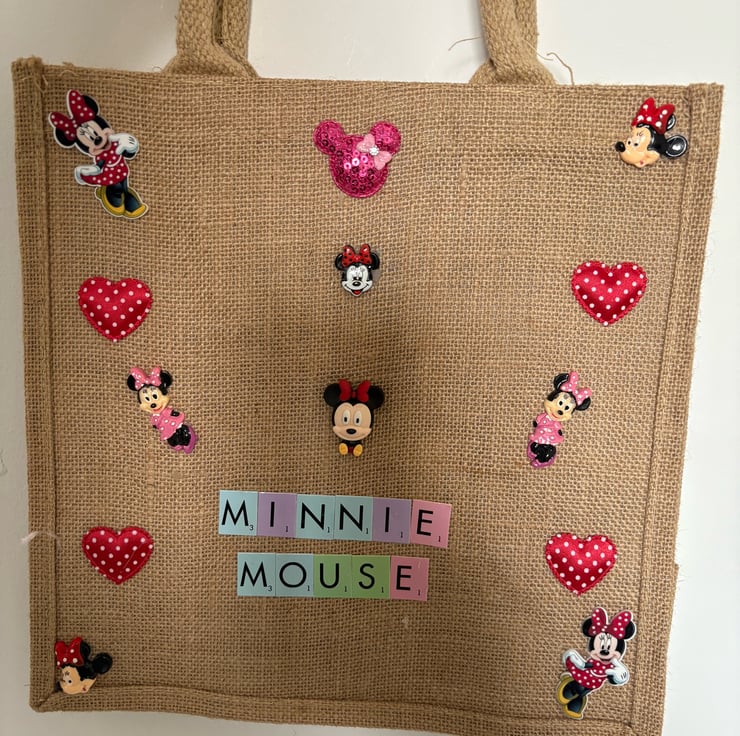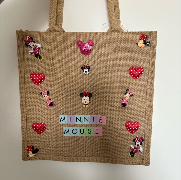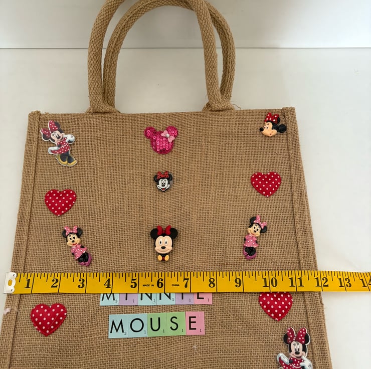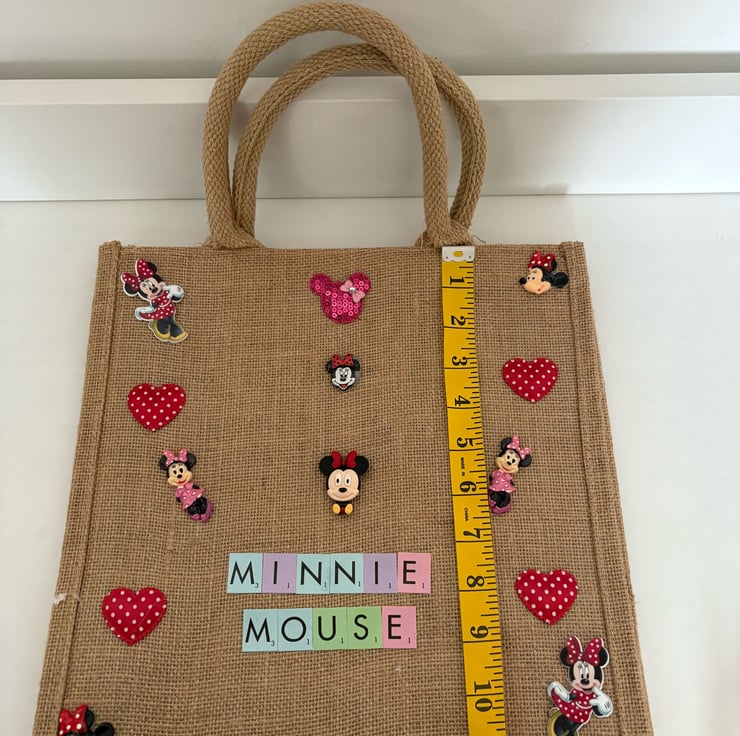 Hand decorated Minnie Mouse jute tote bag.