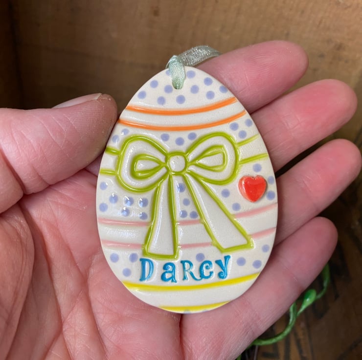 This personalised ceramic easter egg is made from white earthenware clay and decorated with dots and a big green bow . It has a little raised heart detail. This has been fired in an electric pottery kiln, so it is nice and strong. It measures 6cm x 4.5cm and hangs from a matching pale green organza ribbon. It is glazed on the front and left plain on the back.