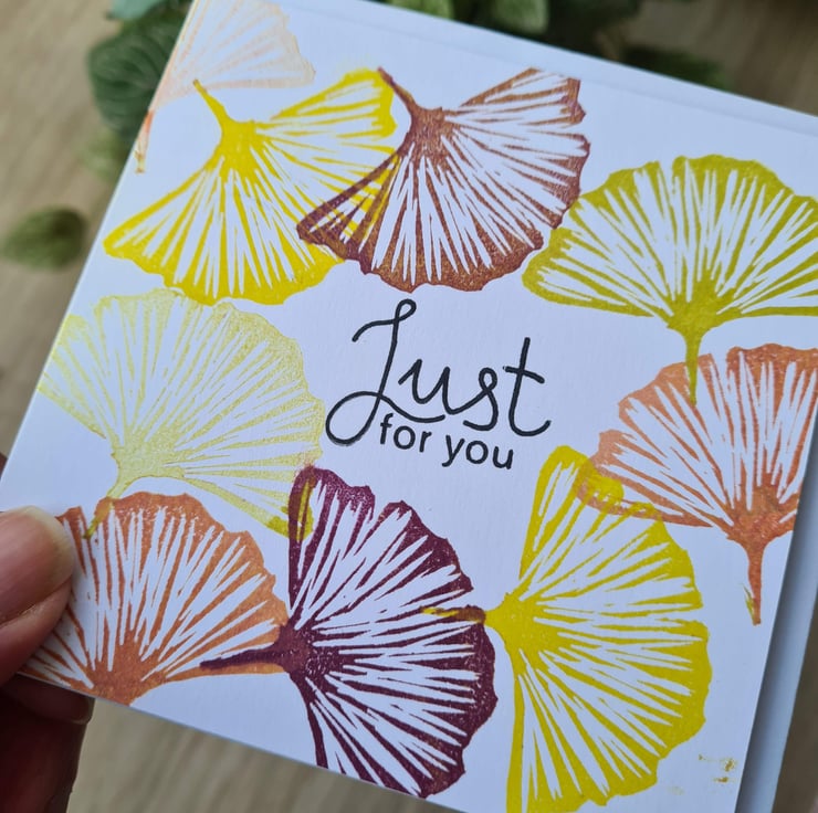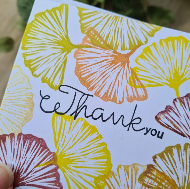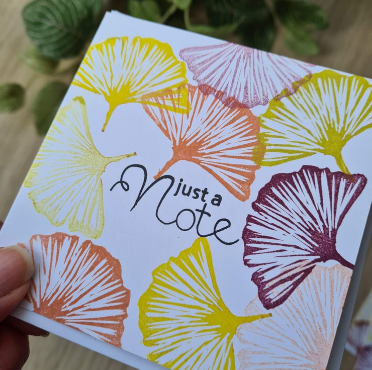 Set of four notecards with envelopes - all handprinted with a ginkgo leaf design, from a rubber stamp which I have designed and carved, and using quality ink pads