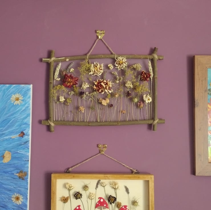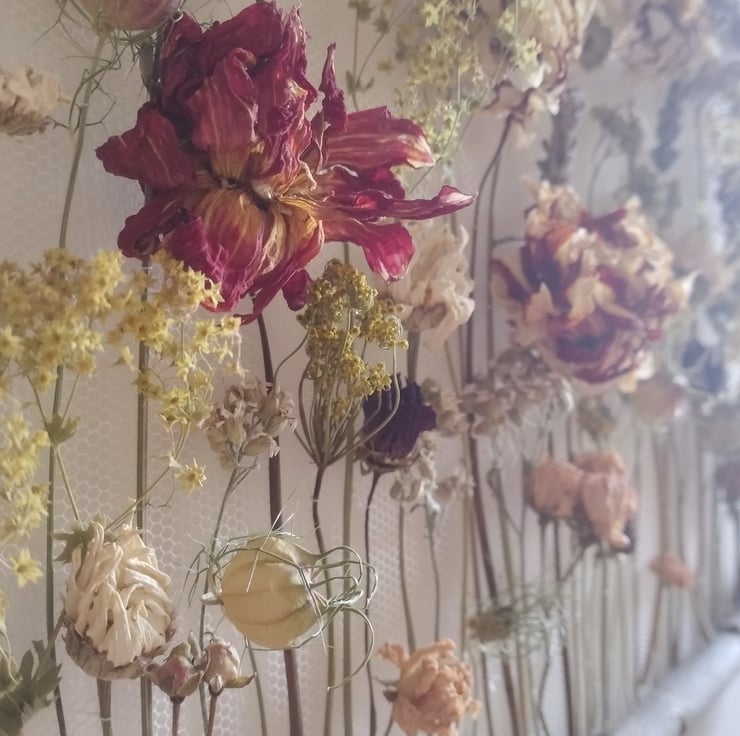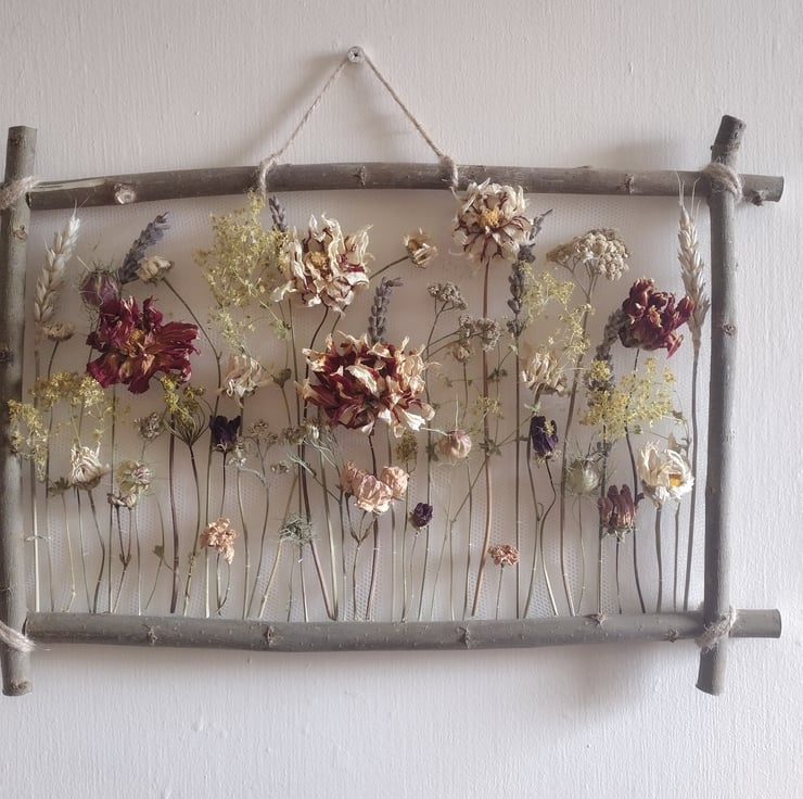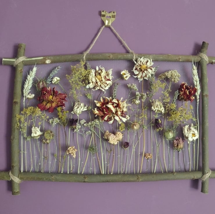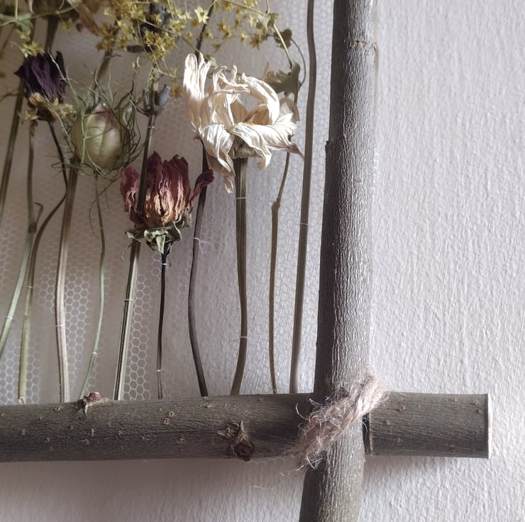 The piece comprises dried flowers carefully stitched onto white recycled tulle, and mounted on a willow frame, allowing each stem to be appreciated for its beautifully perfect imperfections. The flowers were organically grown in peat free compost, picked and dried right here in the Fens from our wildlife friendly garden. The willow is also from our garden. The tulle is manufactured in the UK using industrial nylon waste, which would otherwise be sent to landfill or downcycled.
