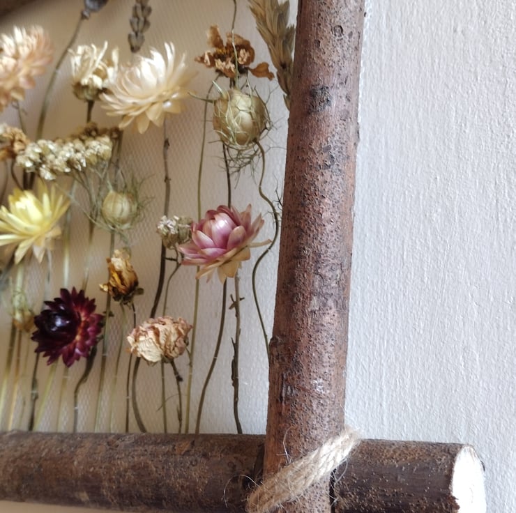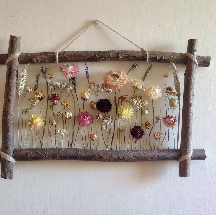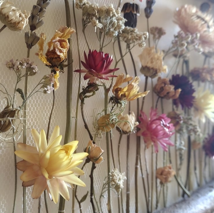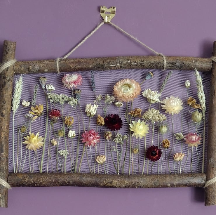 The piece comprises dried flowers carefully stitched onto white recycled tulle, and mounted on a willow frame, allowing each stem to be appreciated for its beautifully perfect imperfections. The flowers were organically grown in peat free compost, picked and dried right here in the Fens from our wildlife friendly garden. The willow is also from our garden. The tulle is manufactured in the UK using industrial nylon waste, which would otherwise be sent to landfill or downcycled.