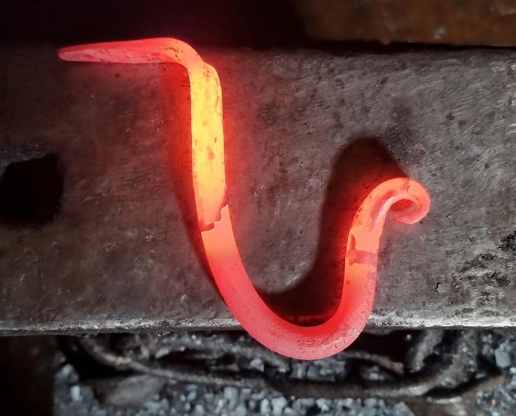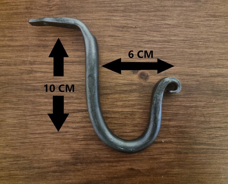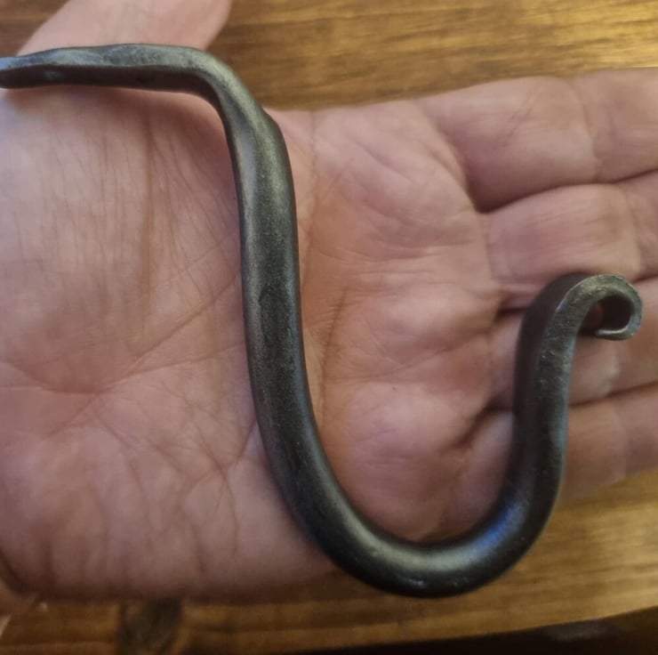 Hand forged under cabinet hooks / shelf hooks. Perfect for hanging cups, pans, utensils etc. Each hook is handmade, giving the hooks a unique look. Can come in either bare metal ( with a rust proof clear coating ). Or blackened with linseed oil applied while the metal is hot for a more traditional look.