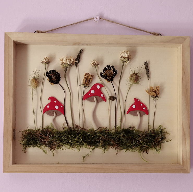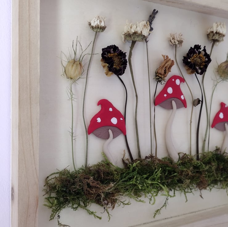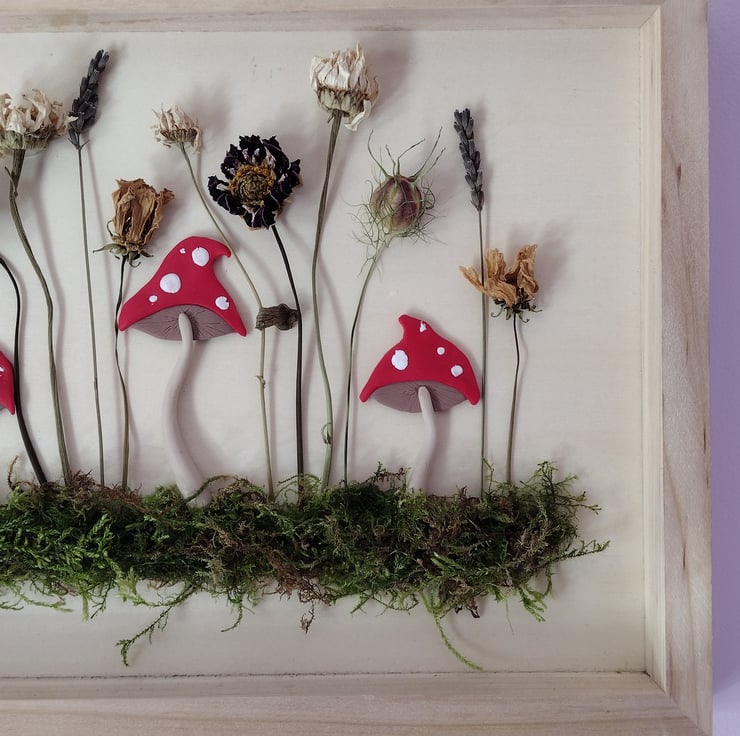 This piece shows a selection of beautiful flowers growing amongst some fly agaric mushrooms. It comprises dried flowers carefully arranged onto a natural wooden background, the mushrooms are made from polymer clay, and they are all nestled on a fluffy bed of moss.