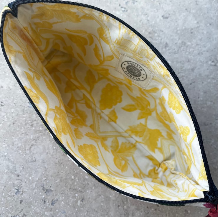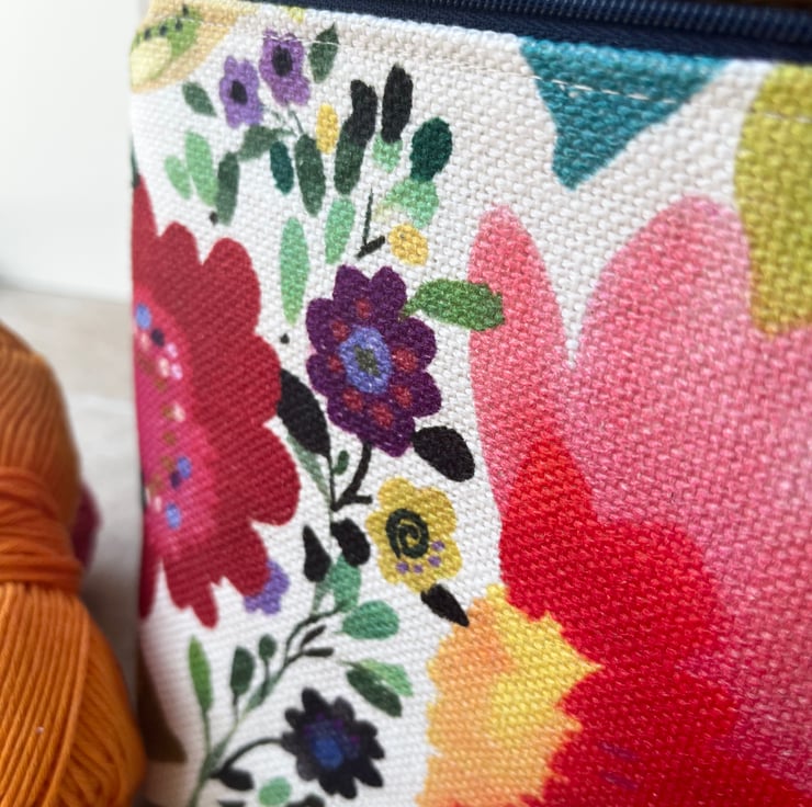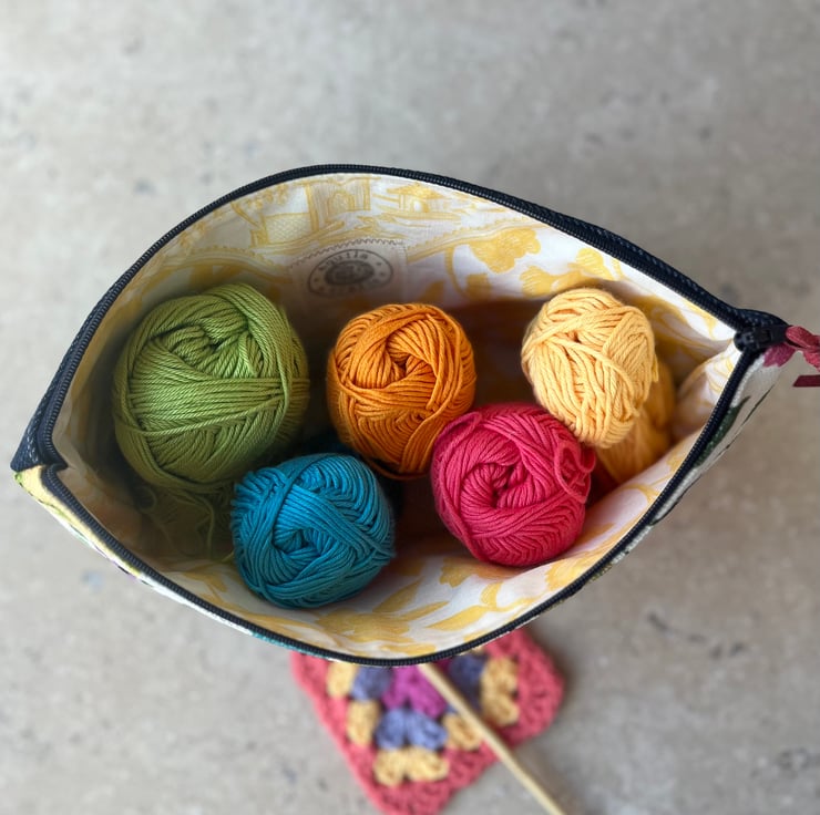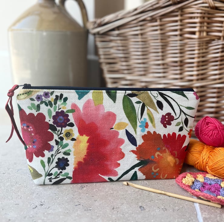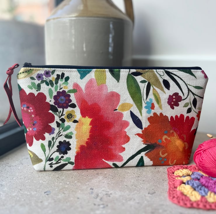 Large colourful zip pouch ideally sized for organising your everyday essentials in your handbag or using separately as a clutch. It could also be used for small craft projects. You could fill it with balls of yarn to make a unique gift for a crochet-mad friend.