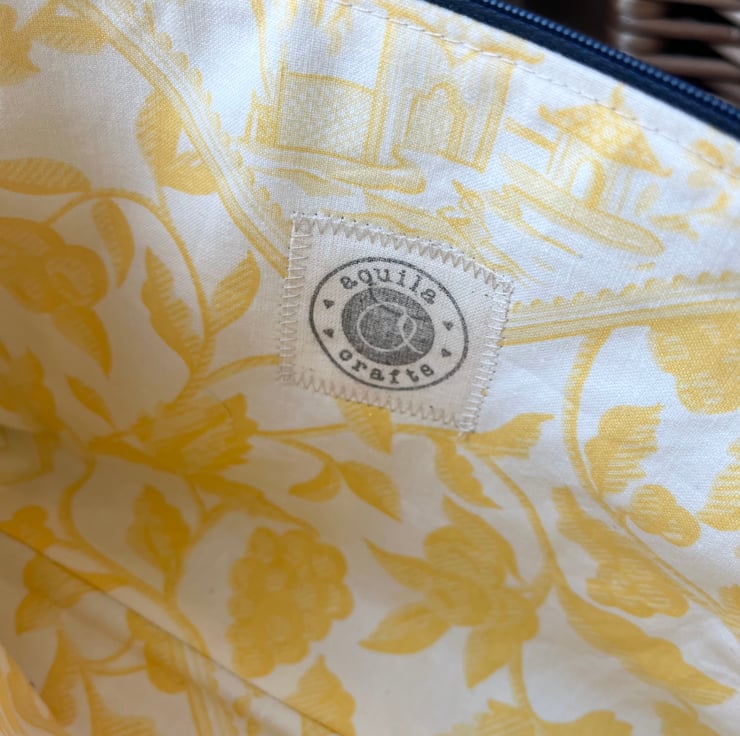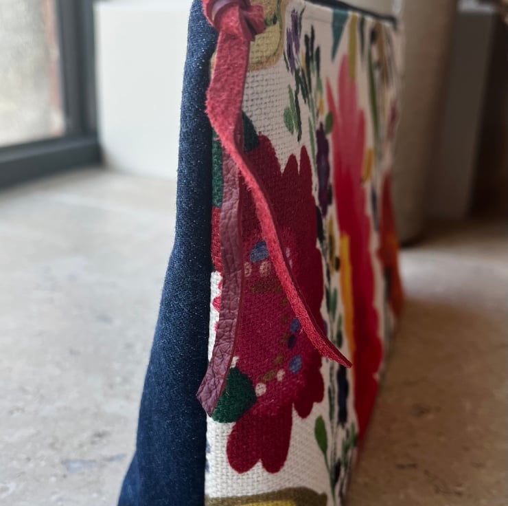 This beautiful floral has a rainbow of colours on a white background. The back is a dark reclaimed denim. The bag is lined with yellow and white pagoda print cotton and there is a layer of interfacing to give the bag a soft structure.