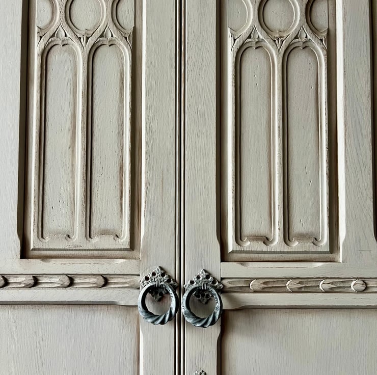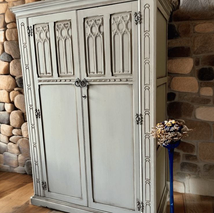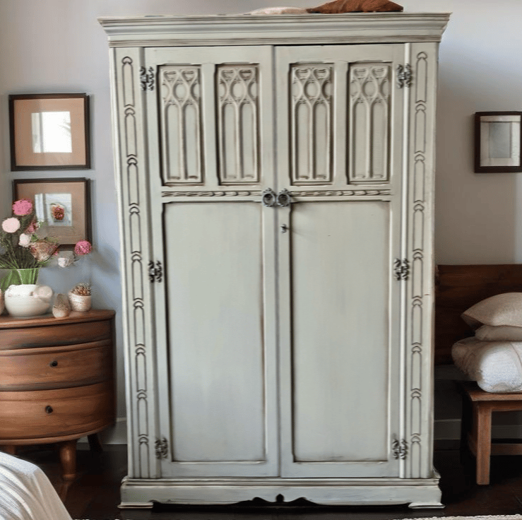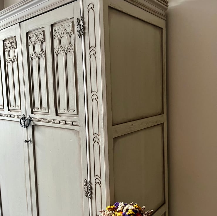 Stunning Large Wardrobe Armoire, whitewashed in Mineral Paint in light grey with distressed and aging details. The inside has been left original with touch of Danish Oil in Jacobean Dark Oak for refresh.