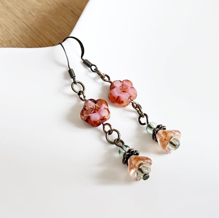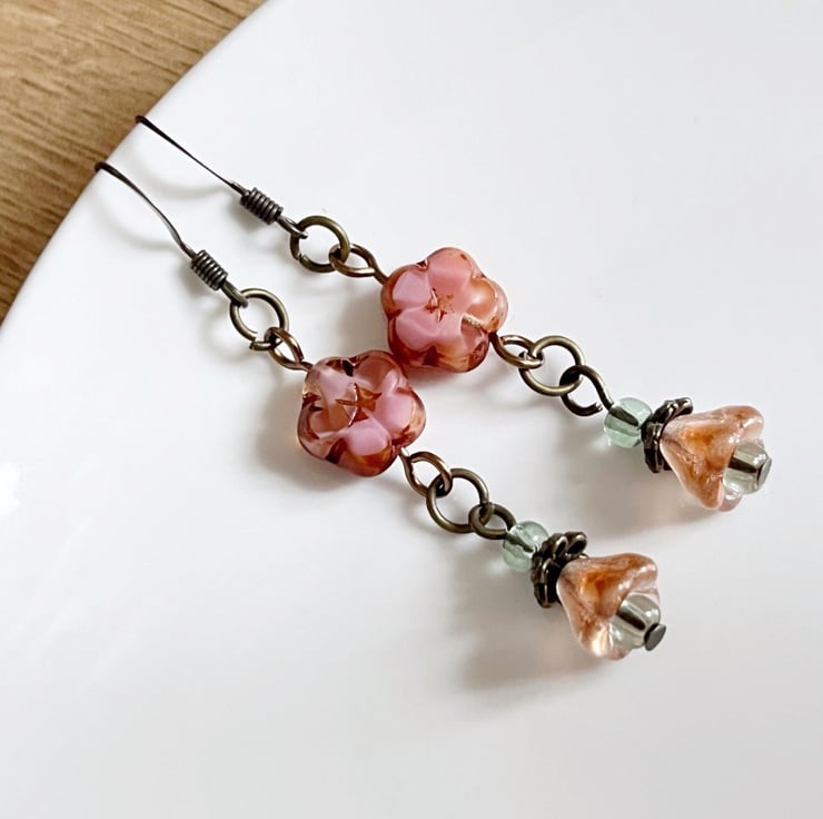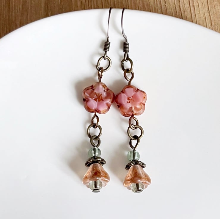 These long pretty flower earrings are in summery rose pink and apple green colours. They have been made with small Czech glass opaque rose pink pansy bead and hanging below are semi opaque pink bell flowers with small apple green seed beads.