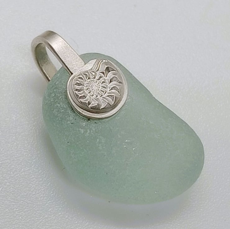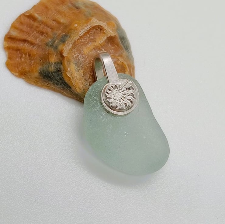Aqua green seaham sea glass pendant suspended from a solid sterling silver bail with Ammonite decoration. This pendant comes with a 18 inch chain in a gift pouch posted via royal mail tracked delivery.