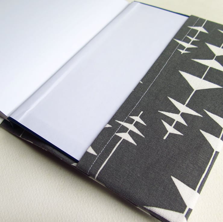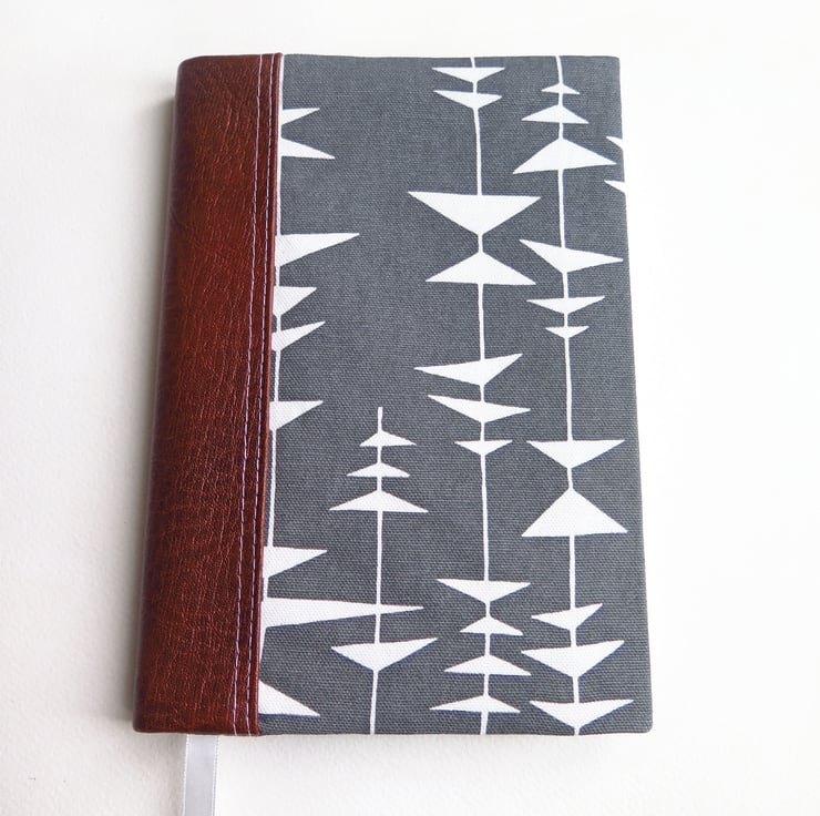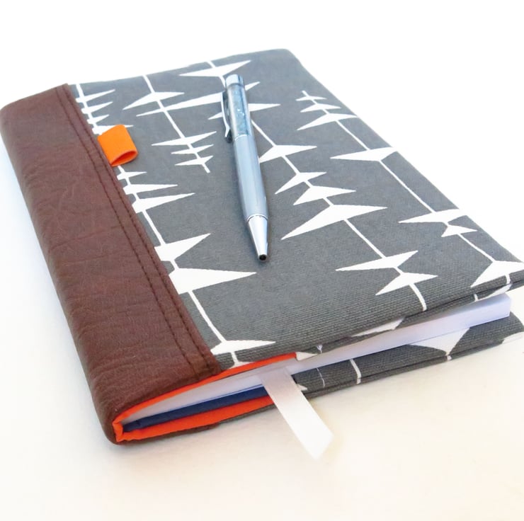 This notebook has a cotton fabric exterior in a charcoal grey and creamy white pattern and an orange polycotton lining. The notebook is lightly padded and has a brown faux leather spine. It features a handy pen holder and a cream ribbon page marker.