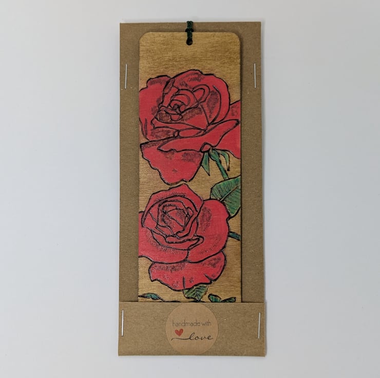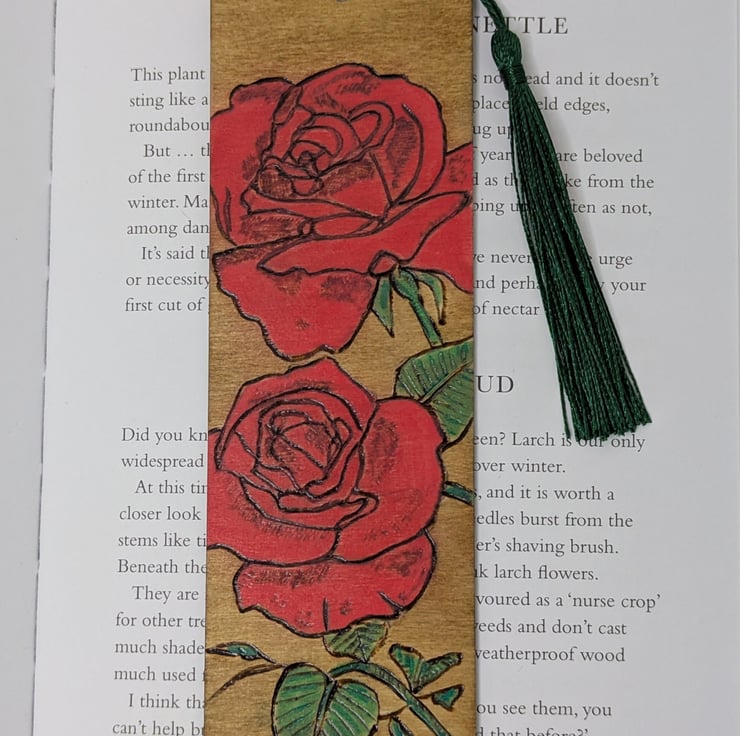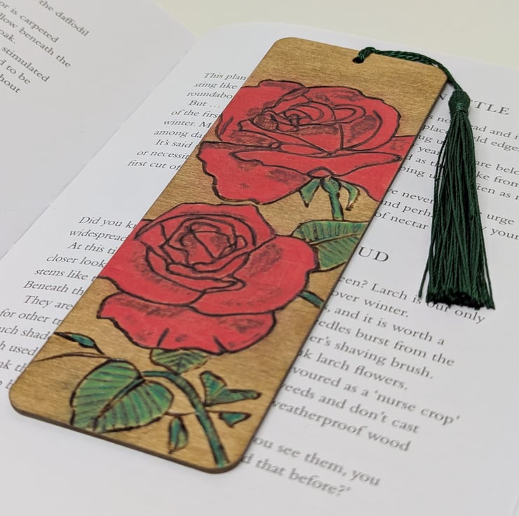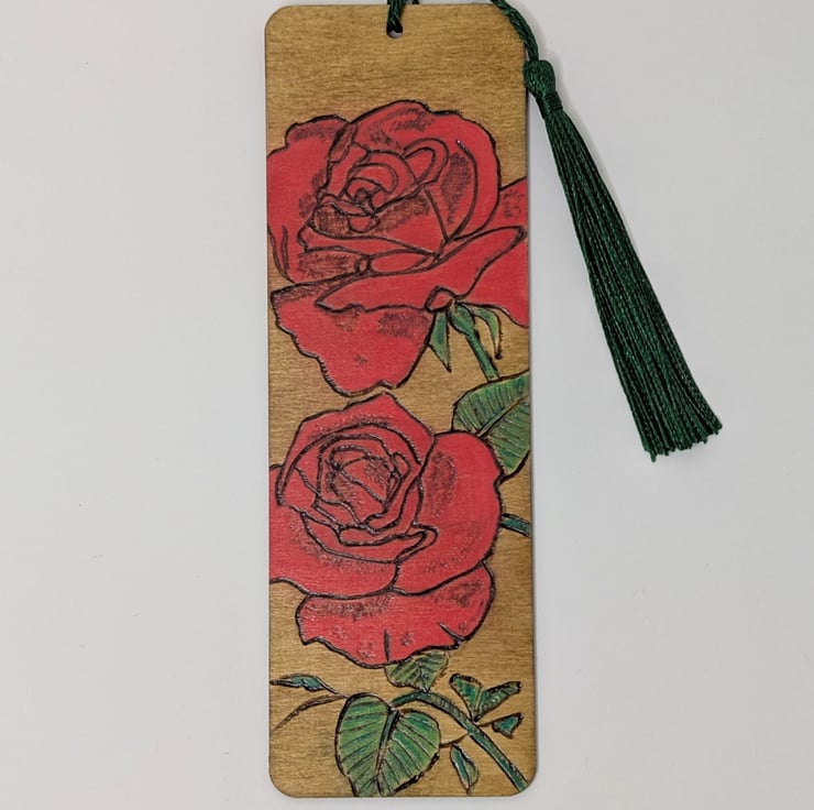 A colourful wooden bookmark, featuring red roses, which has been lovingly hand burnt using the art of pyrography, coloured using acrylic paints for a pop of colour and a light oak stain. Finally the bookmark has been varnished and finished with a dark green tassel. A pretty way to save the page this lovely bookmark would make a great gift especially for Valentines, Mothers Day or a Birthday.