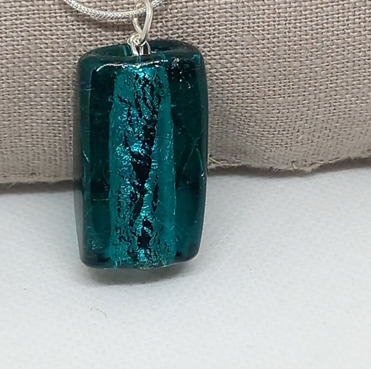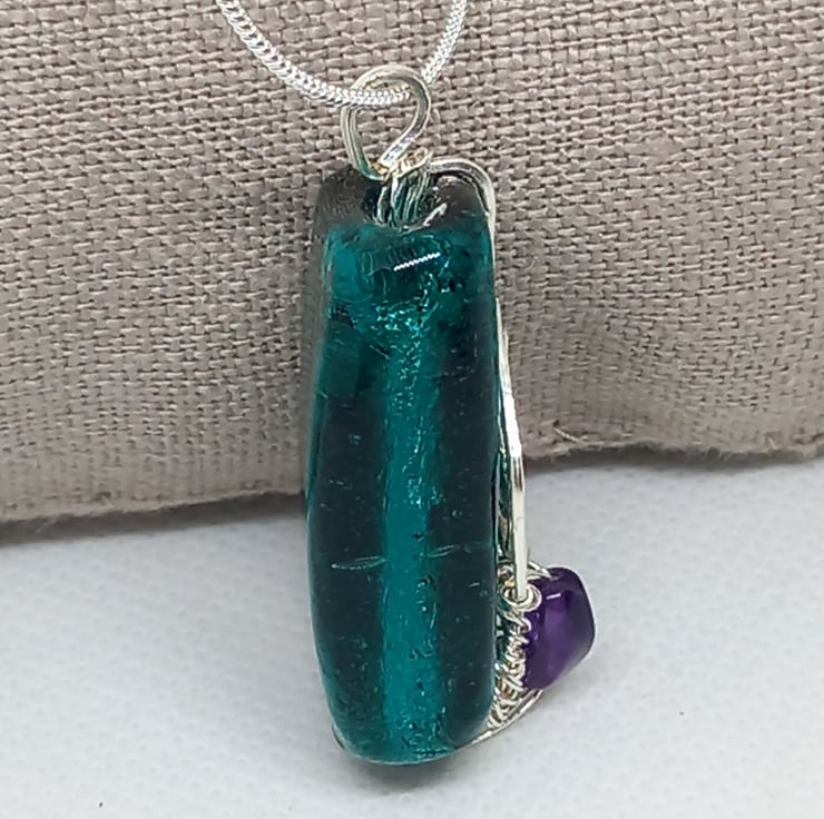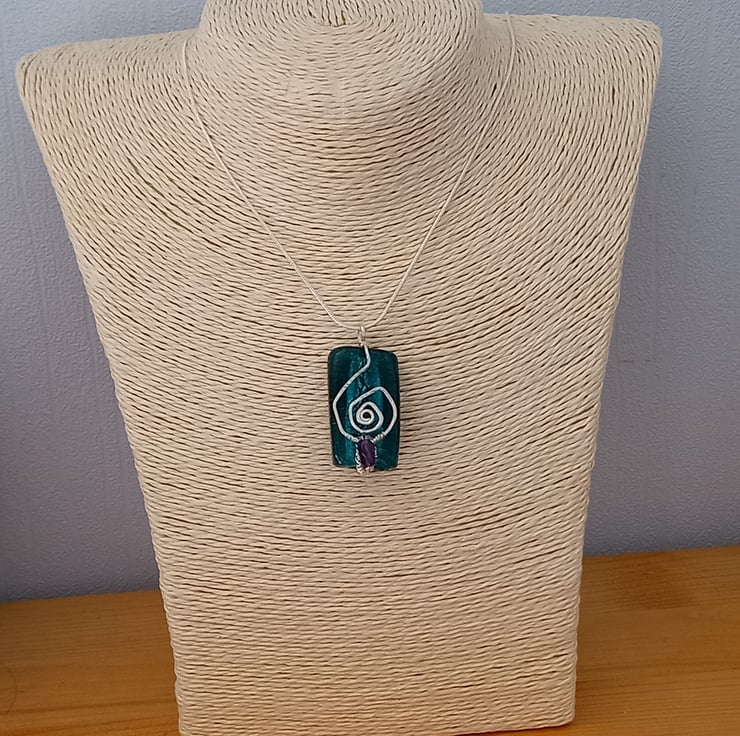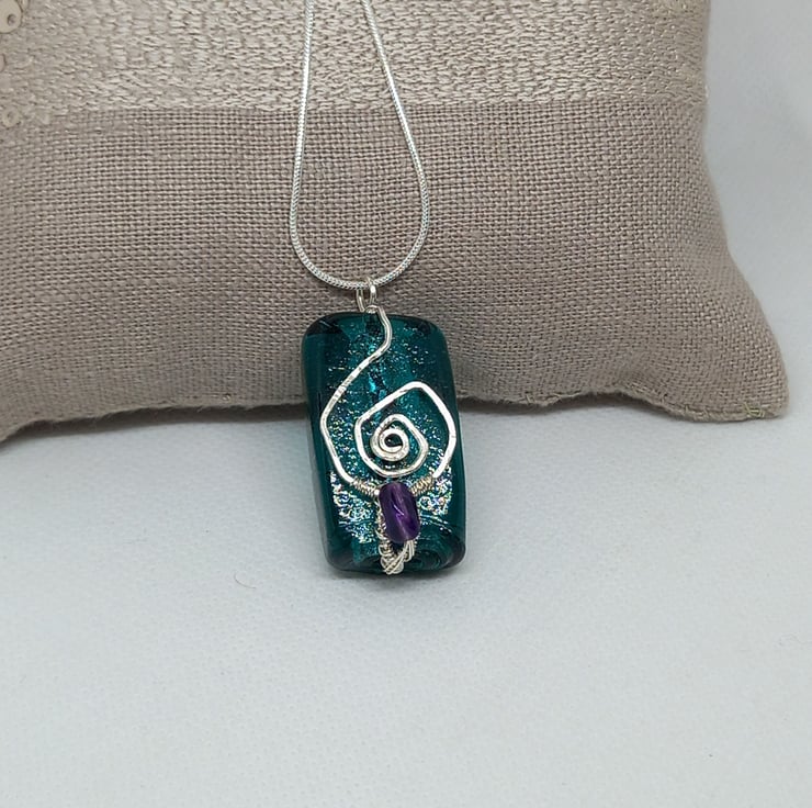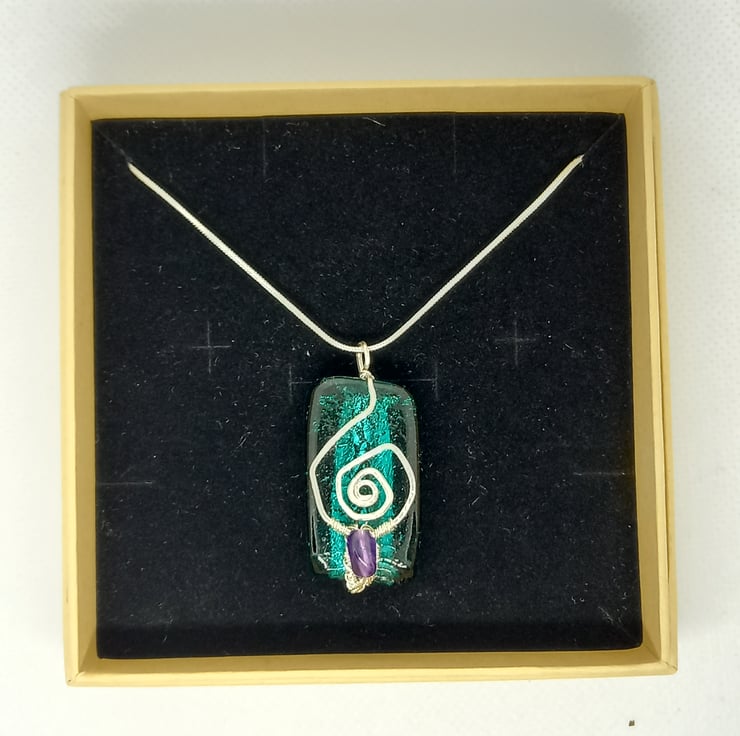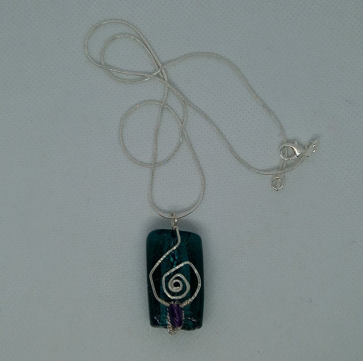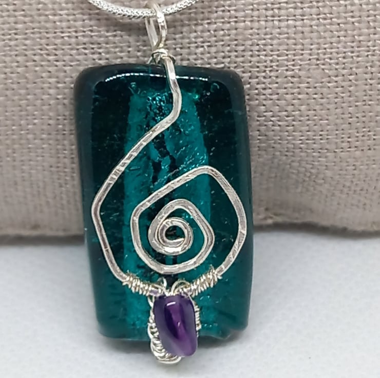 A lovely chunky emerald foil lined glass bead which I have embellished with a spiral of square silver plated copper wire, gently hammered to give it texture. Thin silver plated copper wire holds everything in place and there is a finishing touch of a small amethyst bead. I have formed the square wire into a bail and passed a silver plated snake chain through it to make it into a pendant. Pendant measures 3.5 cm in length and 2 cm wide. The snake chain measures 20 inches.