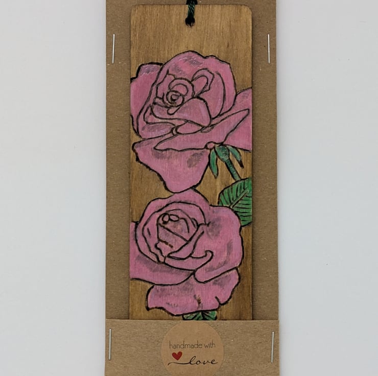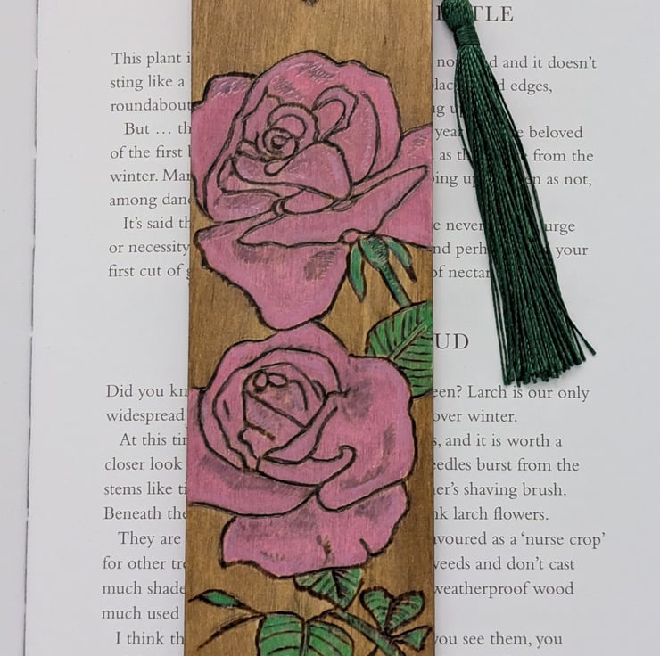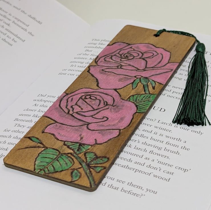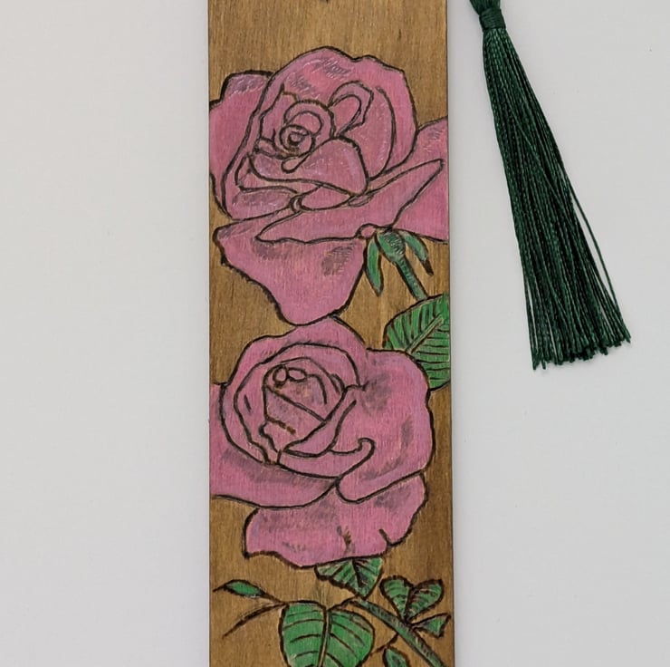 A pretty bookmark made from wood featuring pink roses, which has been hand burnt using the art of pyrography and handpainted using acrylics and a light oak wood stain. The bookmark has been varnished and finished with a dark green tassel. A decorative way to save the page this floral bookmark would make a unique gift perfect for Mothers Day or a Birthday.