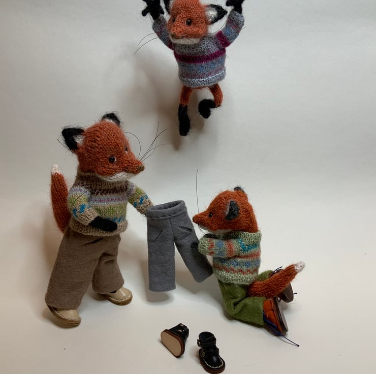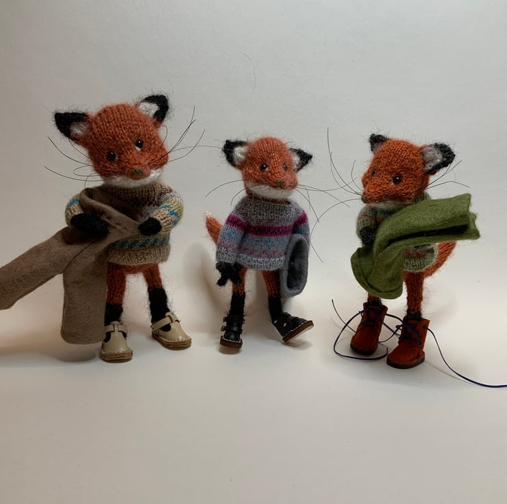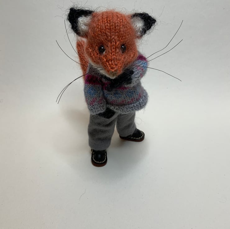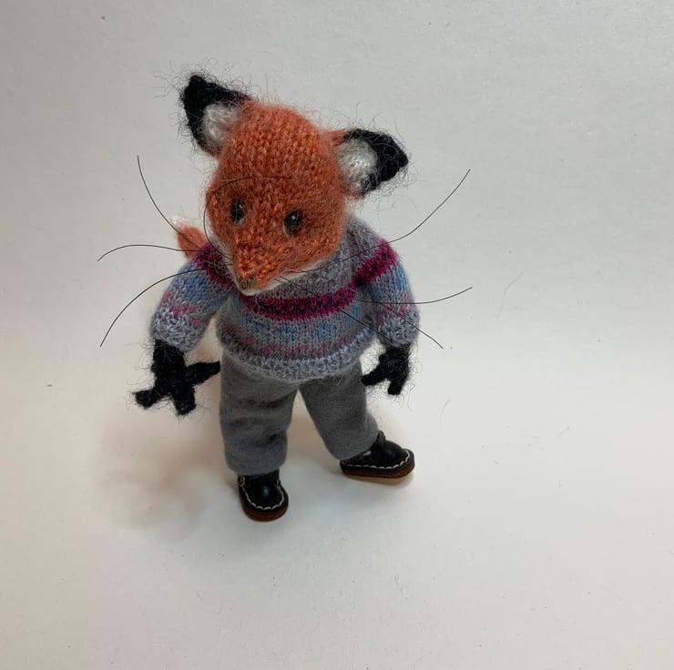 Hand Knitted by me using a mix of soft Alpaca and mohair yarns and the Dot Pebbles Fox Doll pattern.