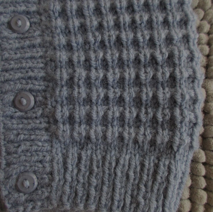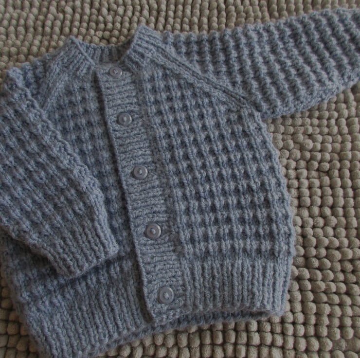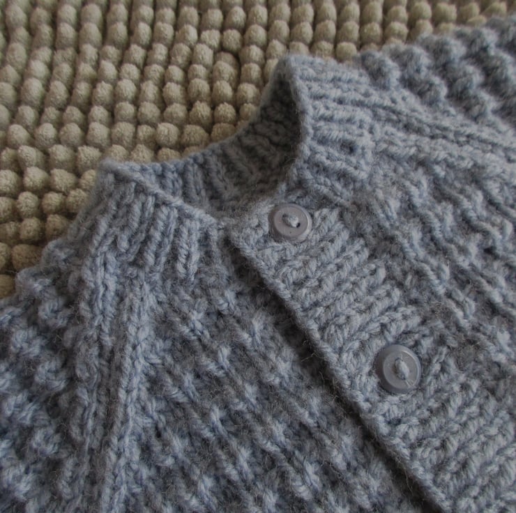 The cardigan has ribbed welt front bands and neckband