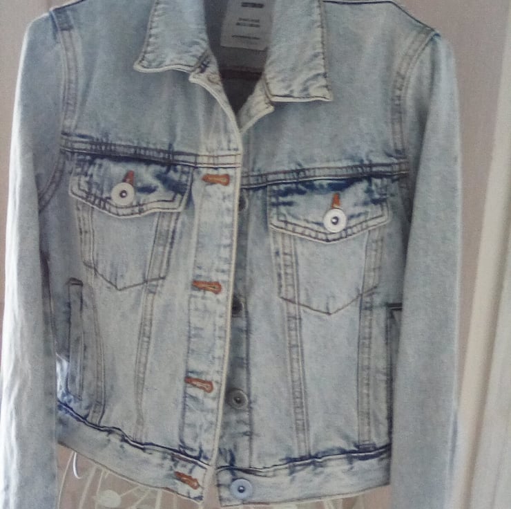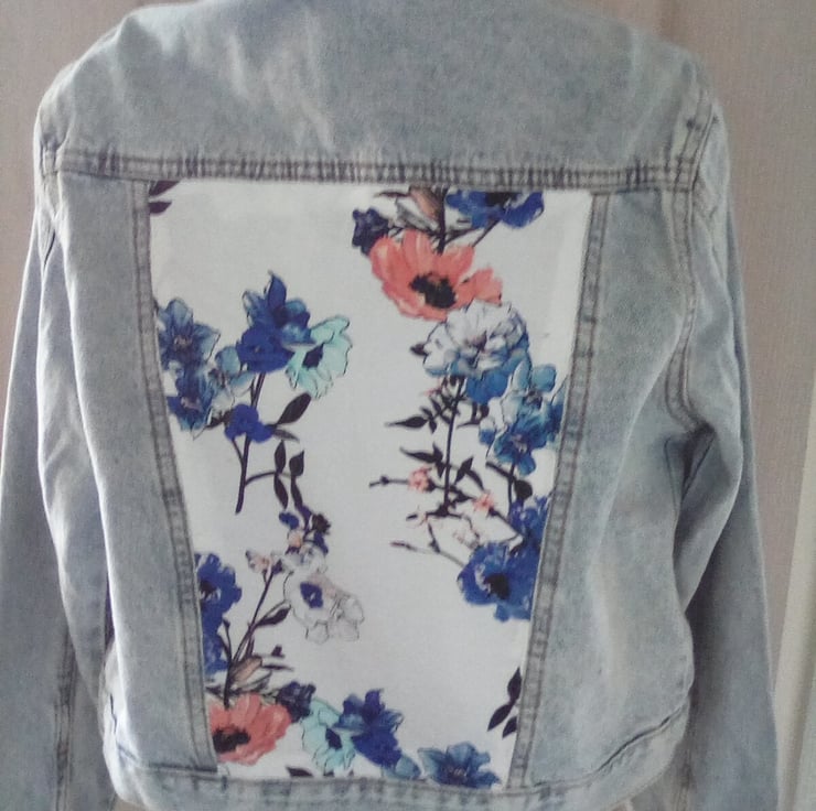 Ladies cropped denim jacket in pale blue (size 8) for sale, which has been modified to include a floral panel appliqued to the back.