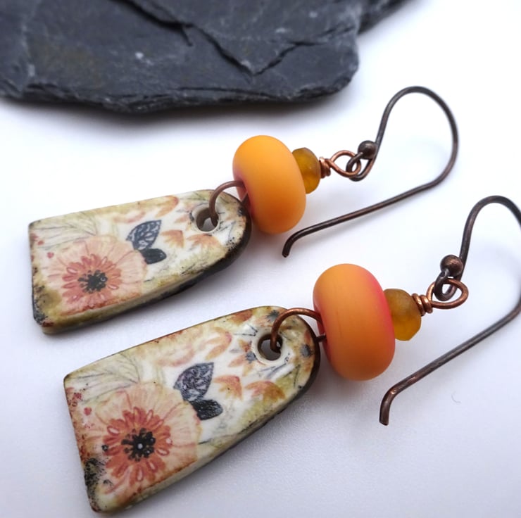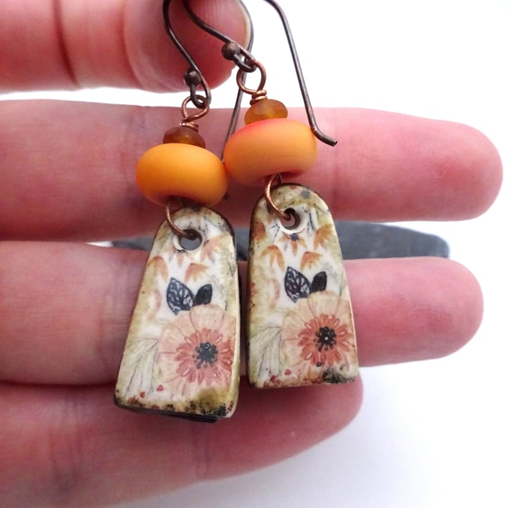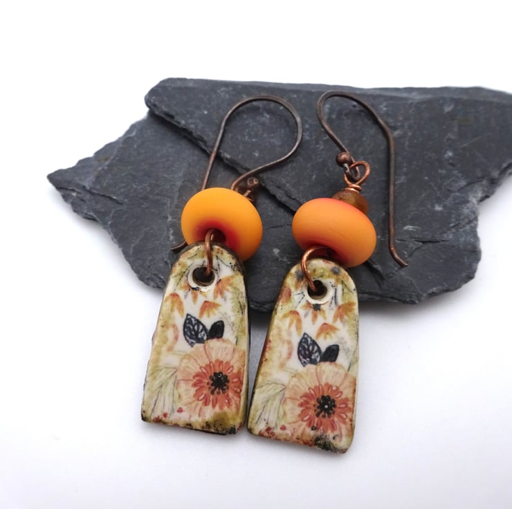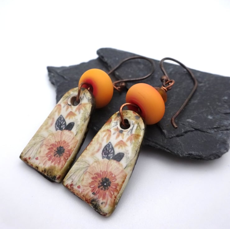 A pair of earrings made with handmade copper ear wires, handmade orange lampwork glass beads and handmade ceramic charms decorated with orange flowers.