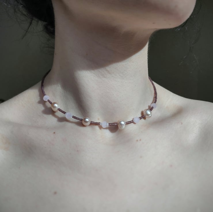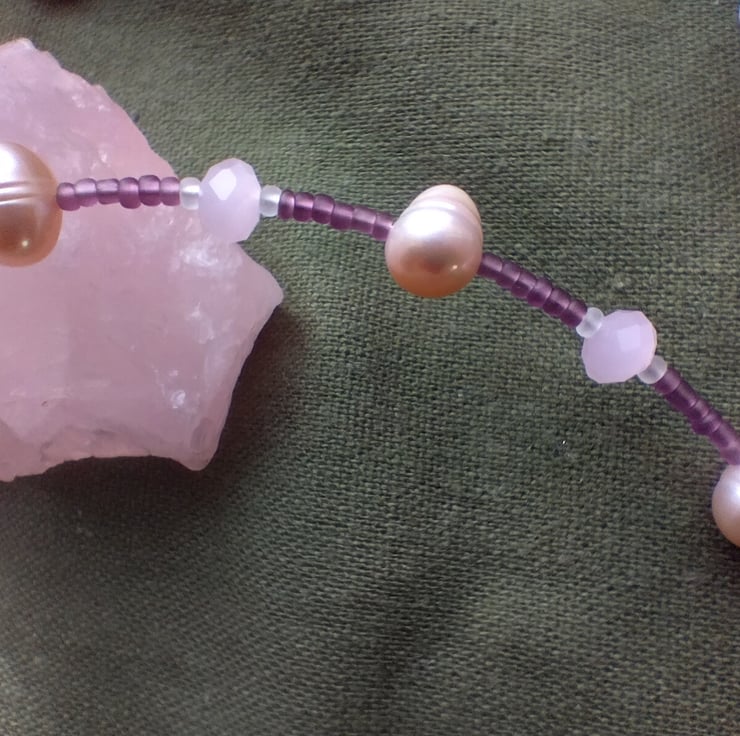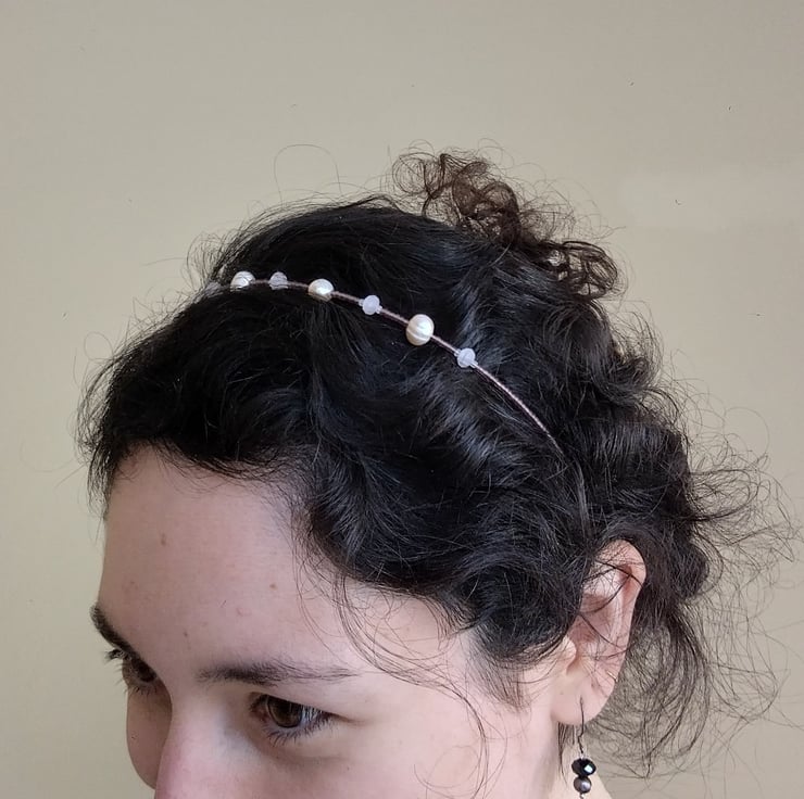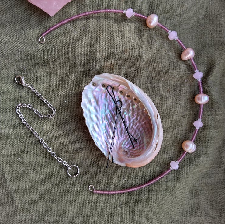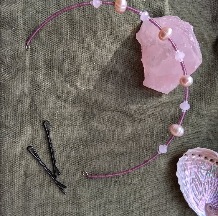 This handmade tiara headband, which can also be worn as a necklace, is made with soft pink pearls and crystal-cut rose quartz, set with an arrangement of white and purple glass seed beads. To be worn as a tiara, hair grips can be used to secure the ends in place. An extension chain and lobster clasp is also provided, which allows the jewellery to alternatively be worn as a choker-style necklace.