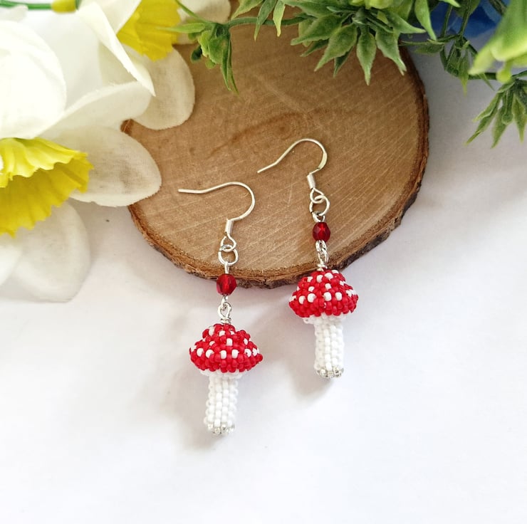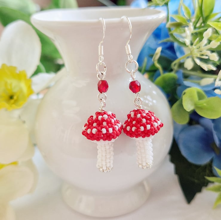 Flaunt your love of fairycore/ cottagecore with our adorably kitsch, red beaded toadstool earrings. Hand beaded using a peyote technique and strong, non-fraying waxed nylon thread, the cute mushroom charms draw the eye with their unique texture. Above hangs a single, faceted glass crystal bead in deep red to accent the charms and add a hint of sparkle. These quirky mushroom earrings are finished with hypoallergenic sterling silver ear wires, making them suitable for everyday wear.