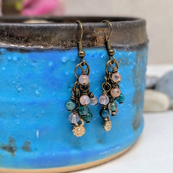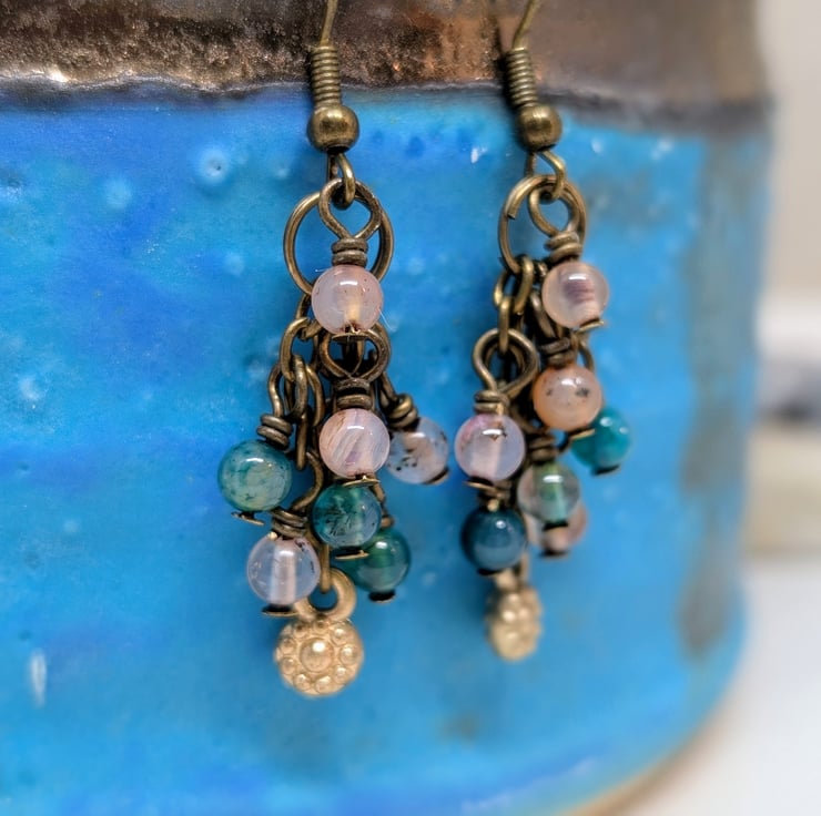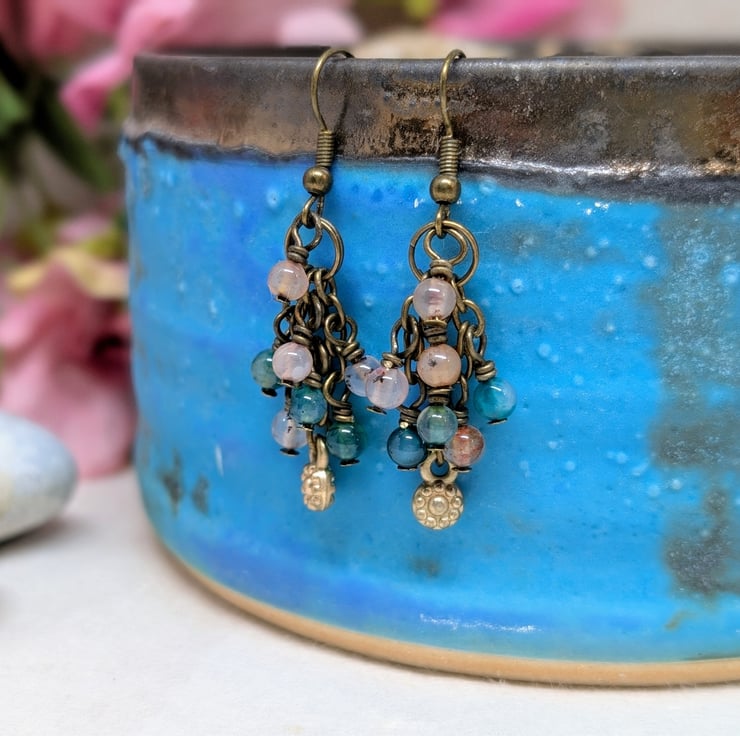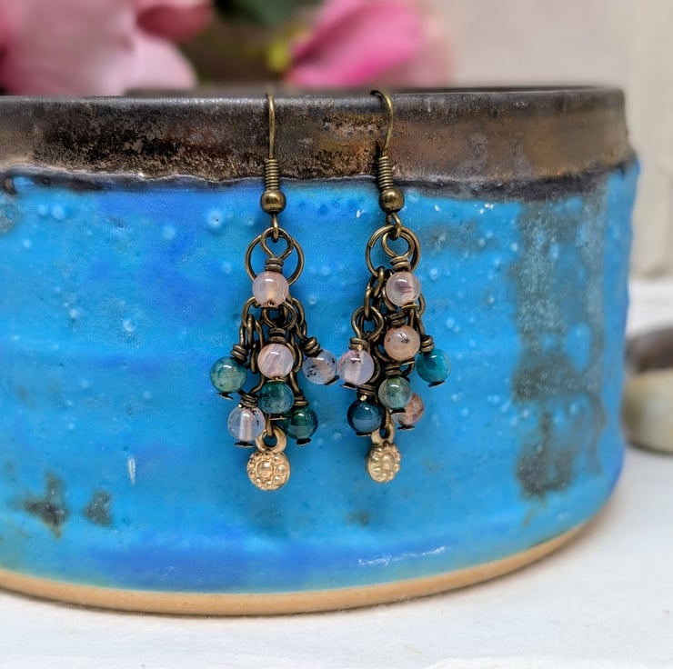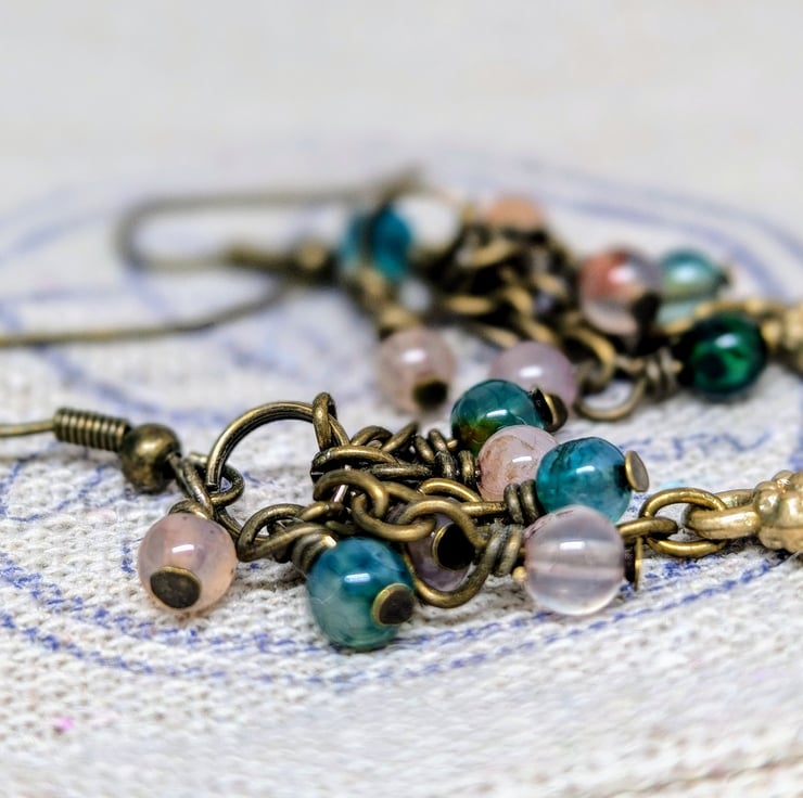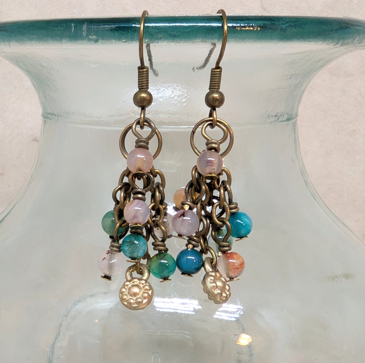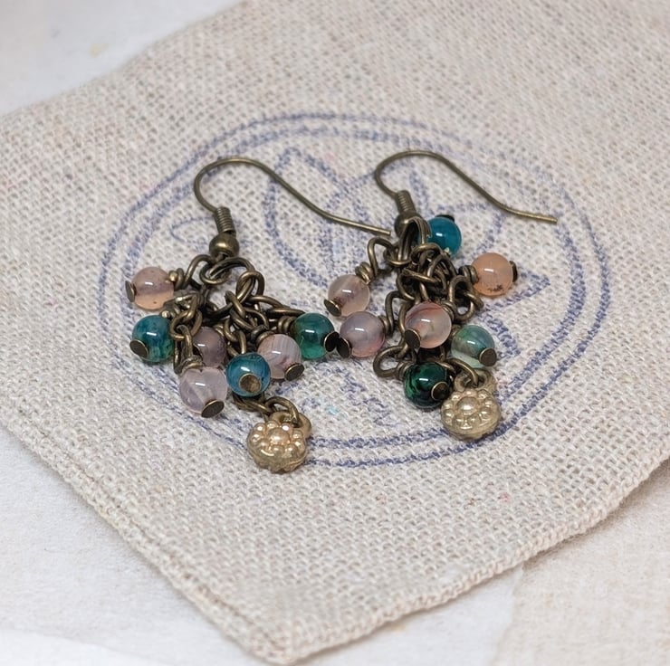 Each of these handmade earrings features three small strands of antique gold coloured chain, decorated with 4mm agate gemstones in shades of peach and blue-green. A tiny golden flower charm adds a sweet detail to the centre length of chain. They have a length of 1.5" making them lightweight and comfortable to wear.