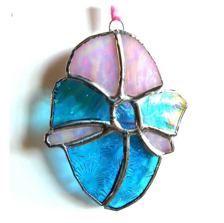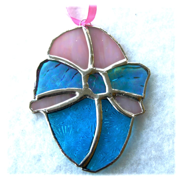A pretty Easter Egg made from two types each of pretty pink and bright turquoise glass. THe egg has a pretty two colour bow.
