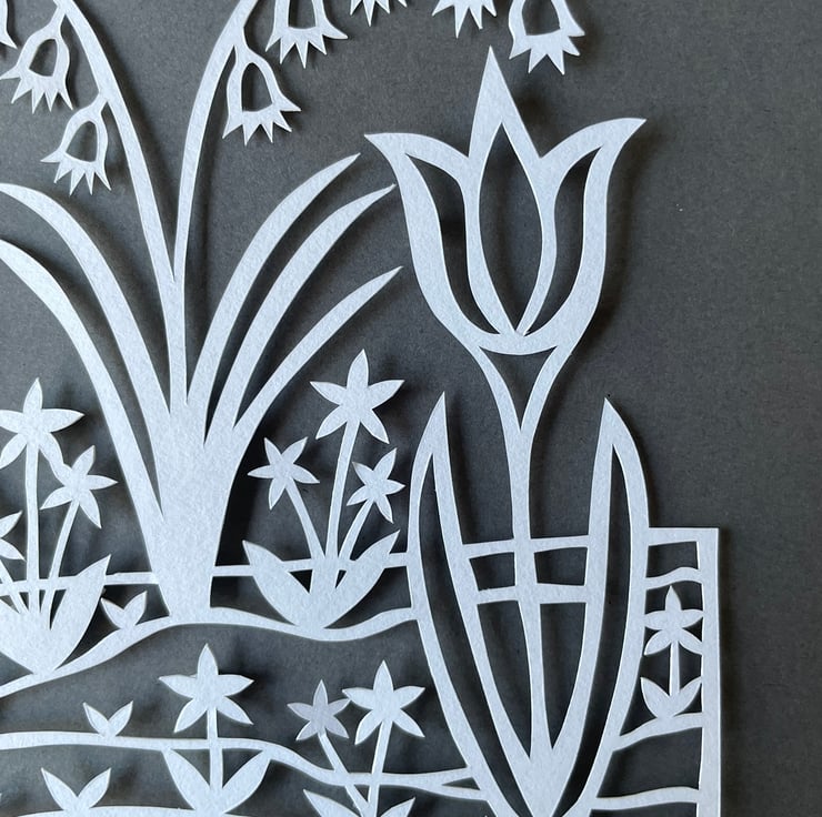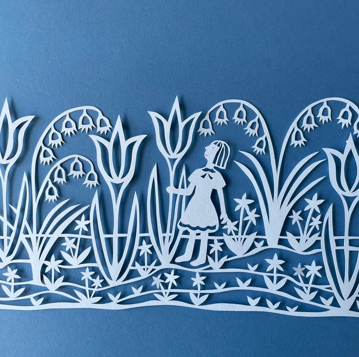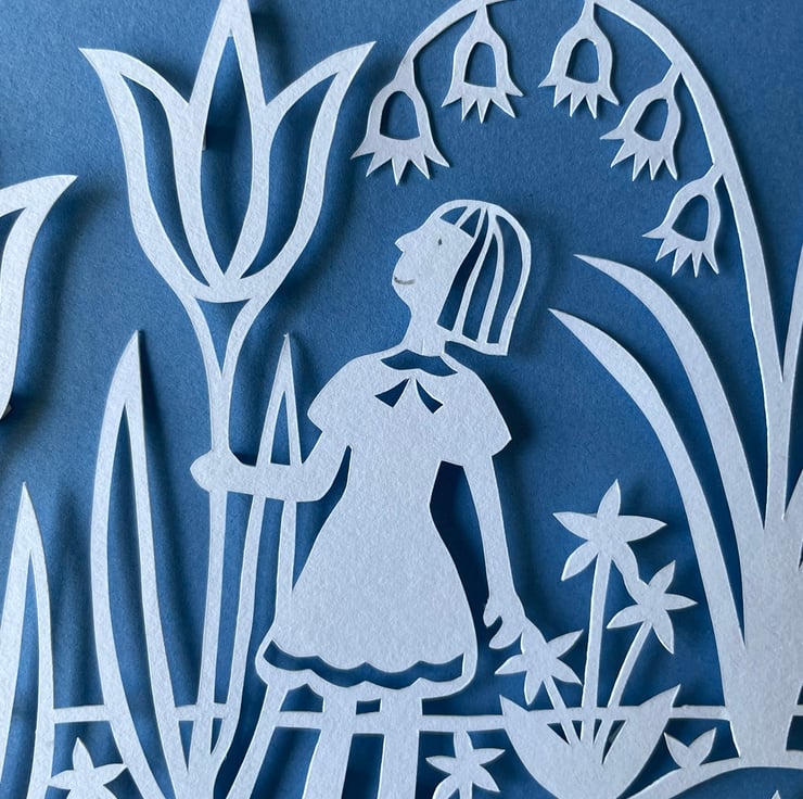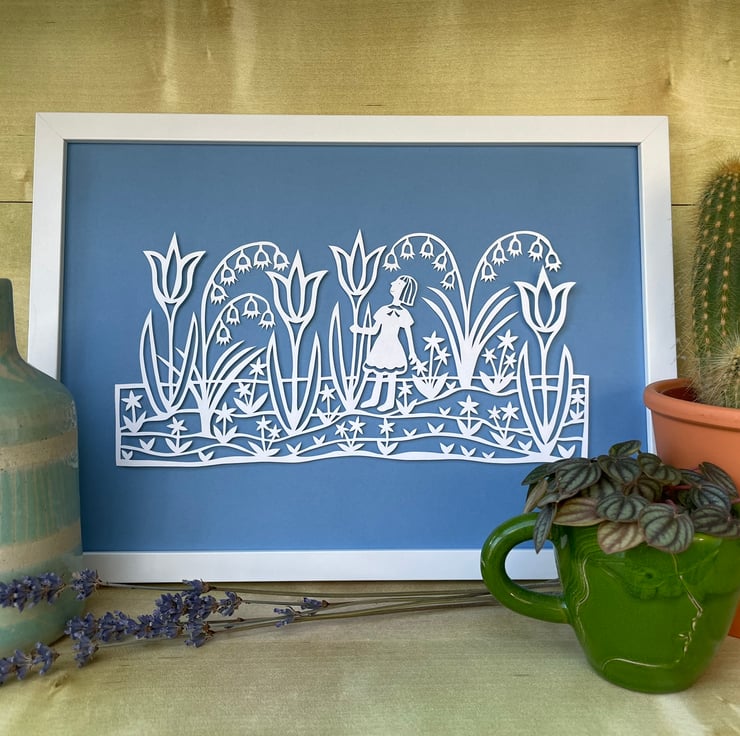 This original A4 sized papercut is a celebration of springtime, featuring a girl wandering through a garden of giant tulips and bluebells. The papercut is handmade, cut into bright white paper and placed over a coloured background using foam stickers between the layers of paper to produce a beautiful shadow effect.