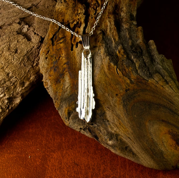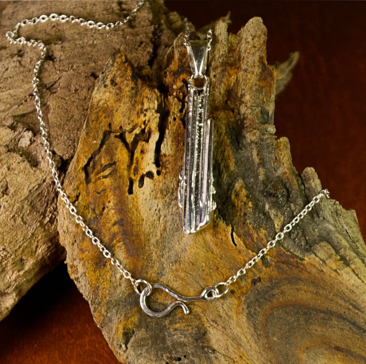 Molten silver is poured into dry spaghetti to form unique ingots of this most pleasing metal. An ingot was then chosen to be transformed into this beautiful pendant by attaching a ring and handmade bail.
