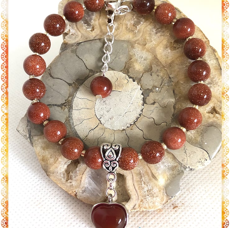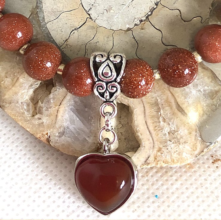 Created using this goldstone gemstone heart in a silver plated tray, with a Tibetan silver connector with 8 mm goldstone beads threaded onto memory wire finished with a lobster clasp & extension chain Nickel free