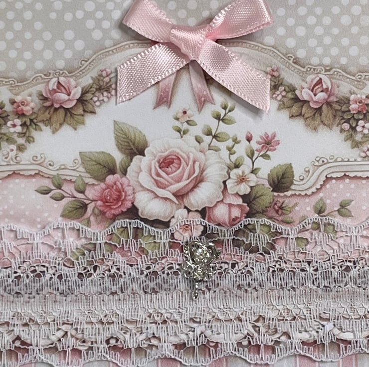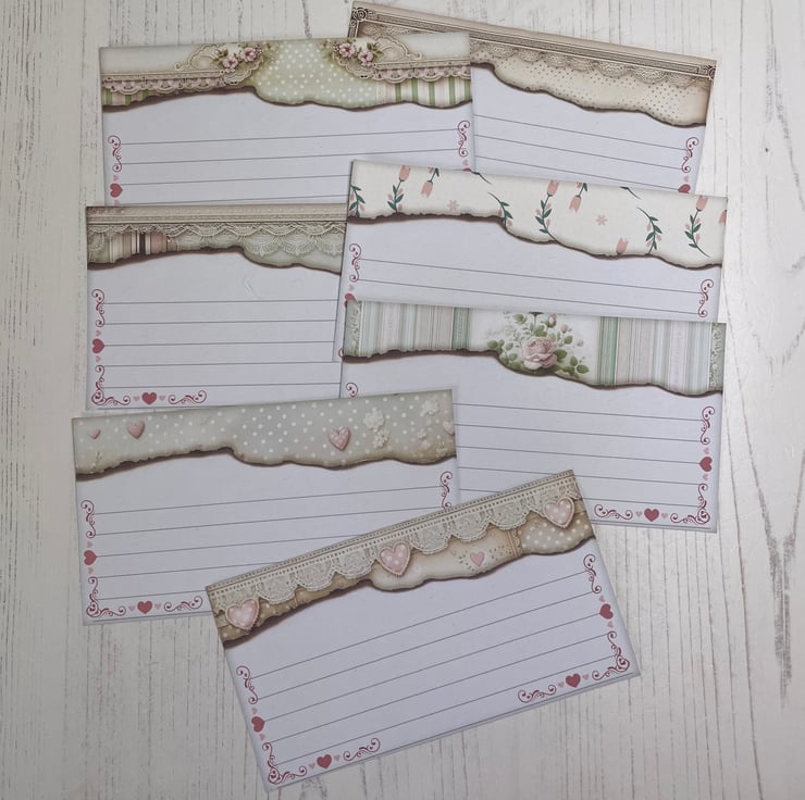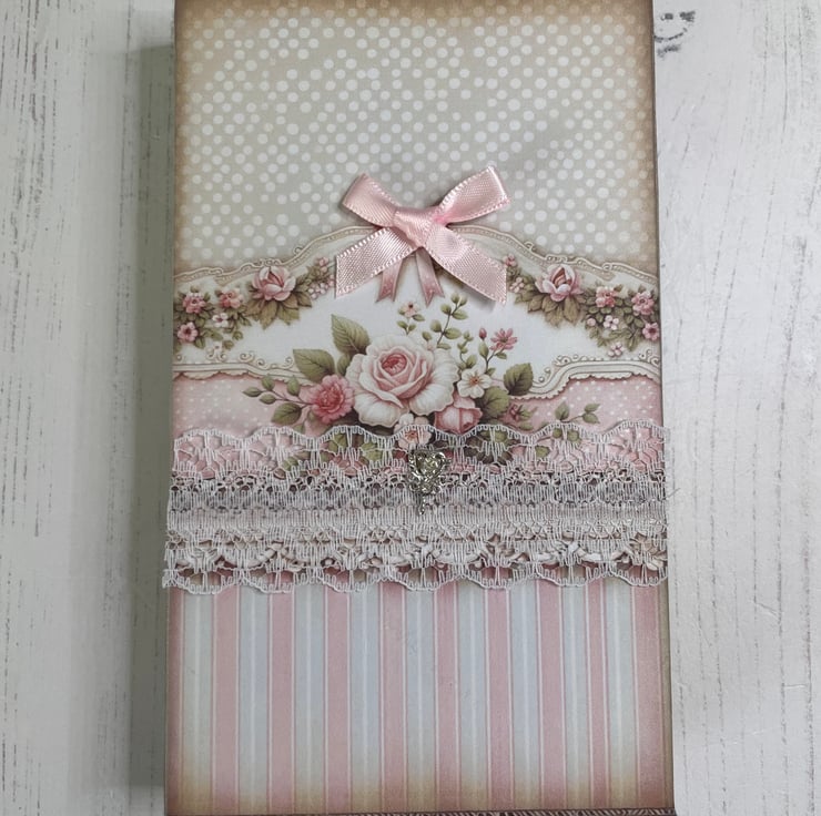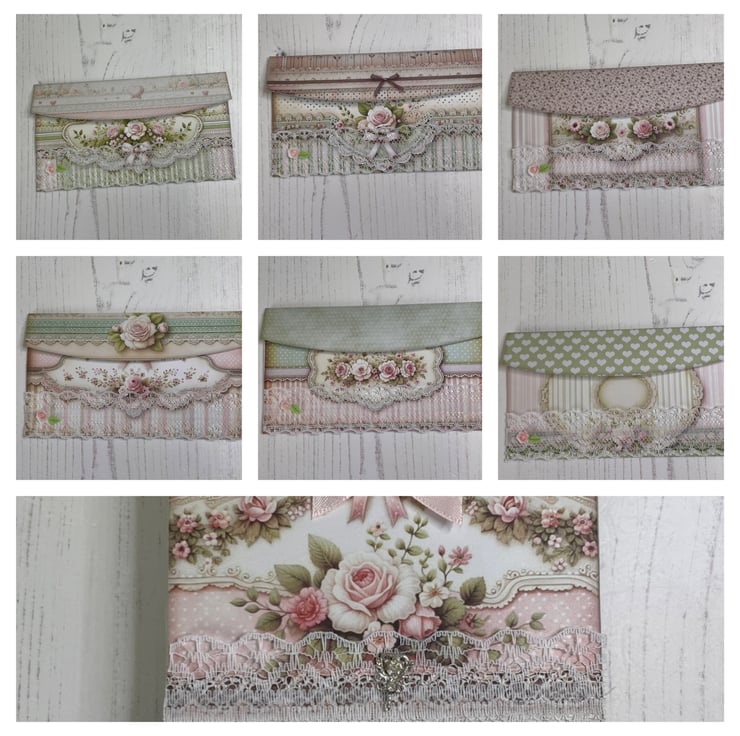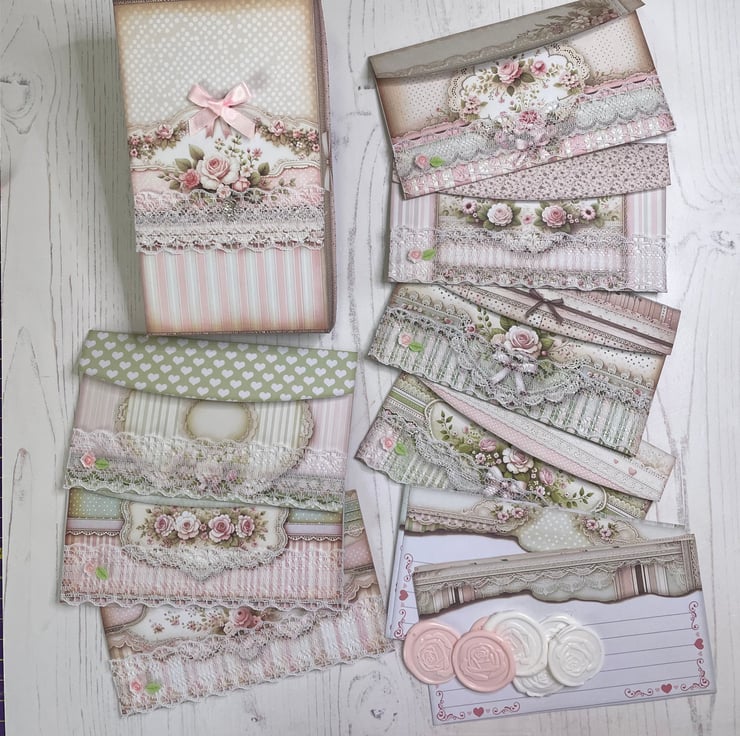 A pretty printed box decorated with lace, ribbon bow and mini crystal charm. Contains 7 envelopes for cash decorated with lace and a mini rose and leaf. 7 notes to add to the envelope with a message. 7 handmade wax seals with adhesive backs to seal the envelope shut.
