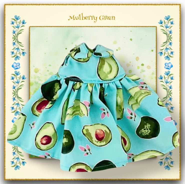 A lovely dress, in a really unusual avocado print, to fit the Mulberry Green dolls. The dress is handmade from best quality cotton, has a lined bodice and fastens at the back with a little popper