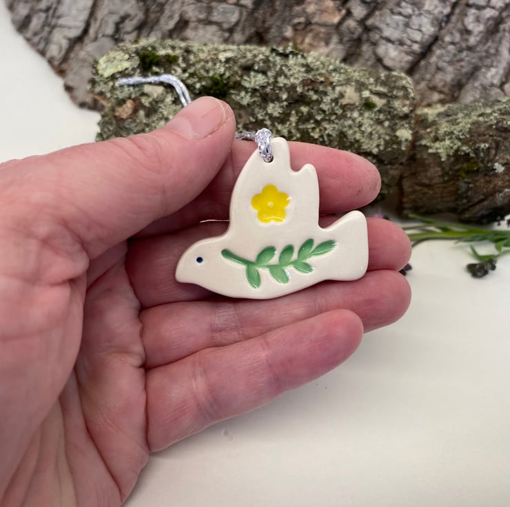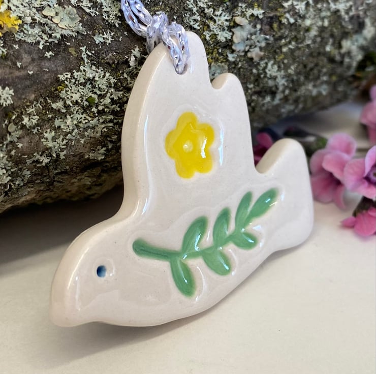 This little ceramic dove decoration is made from white earthenware clay and finished with leaves and a flower This has been fired in an electric pottery kiln, so it is nice and strong. It measures 4.5cm x 4cm and hangs from a silver string. It is glazed on the front and left plain on the back.