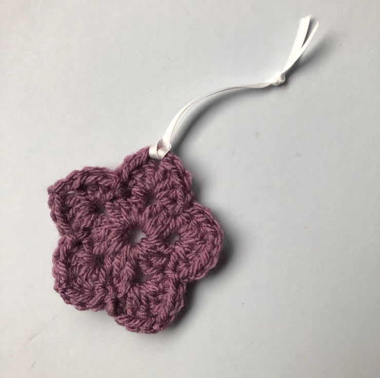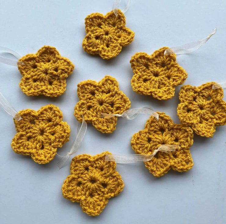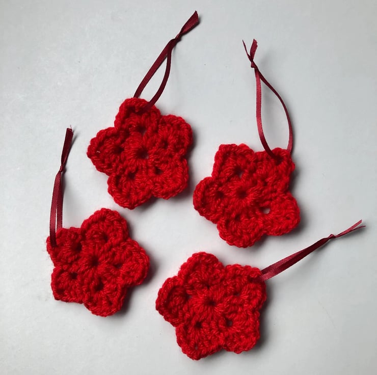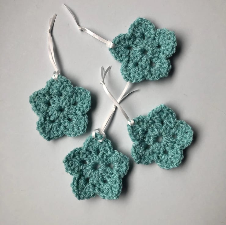 These beautiful hanging flowers or stars have been crocheted carefully from acrylic aran yarn by Rachel and Ann. Each set includes 4 stars, each of which is approximately 7.5cm diameter. They can be hung from a Christmas tree, an Easter tree or door handle with their ribbon loop.