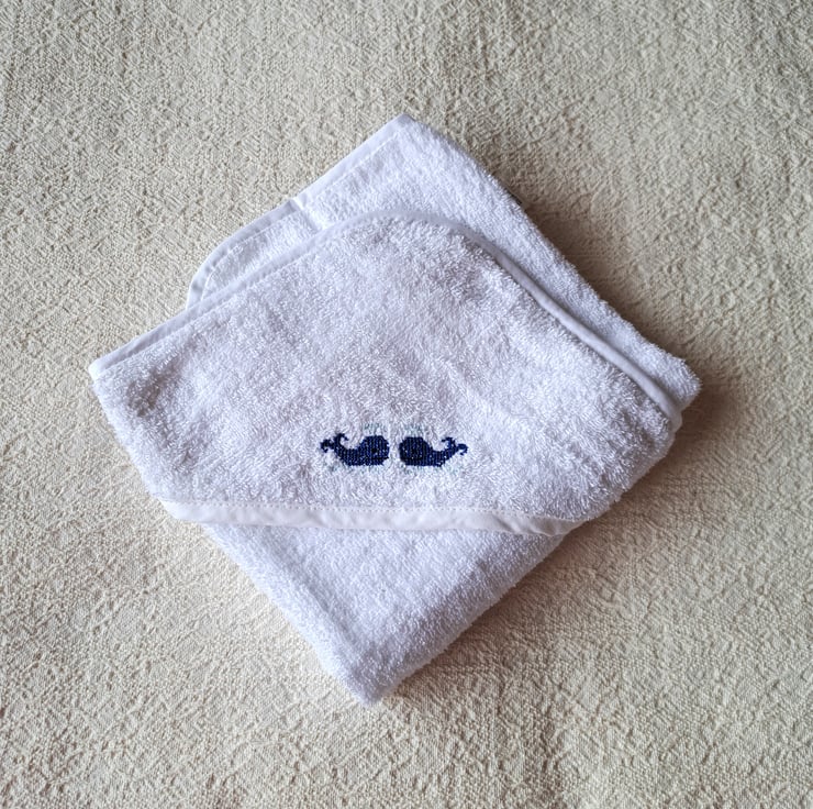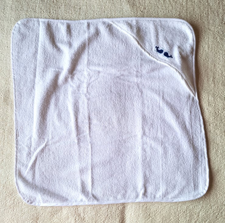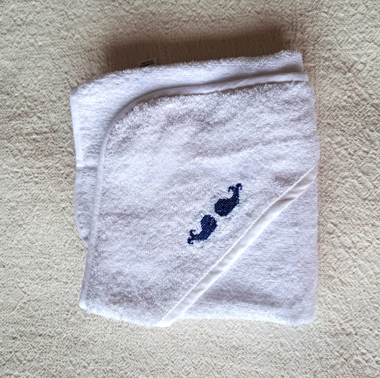 I have hand embroidered two blue whales facing each other and spouting water on this lovely soft white hooded baby towel from Tesco. Bound with white bias binding, it measures 70cm. square approximately, is all cotton and can be machine washed.