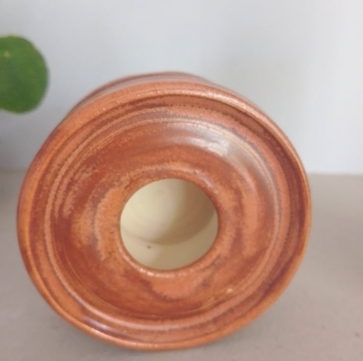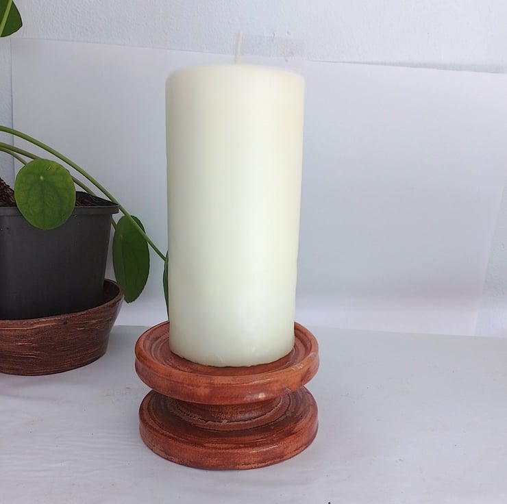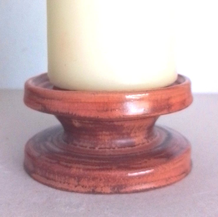 Thrown by Penarth ceramics this is a candleholder suitable for church and pillar candles measuring 2 .5 inches to( 3.5 inches or 9 cms) diameter. Heavy bottomed for stability. Colored in a semi matt autumn brown mottley finish. Stands 5.2 cms x 10 cms diameter.