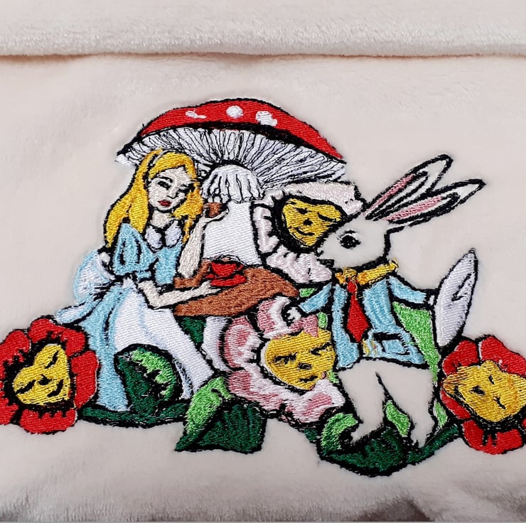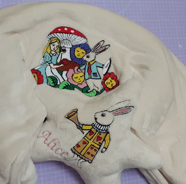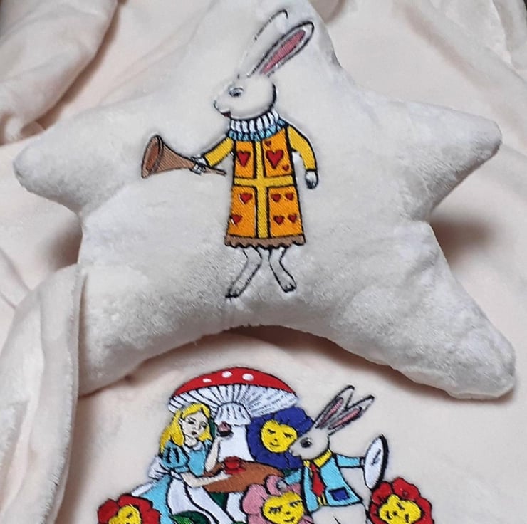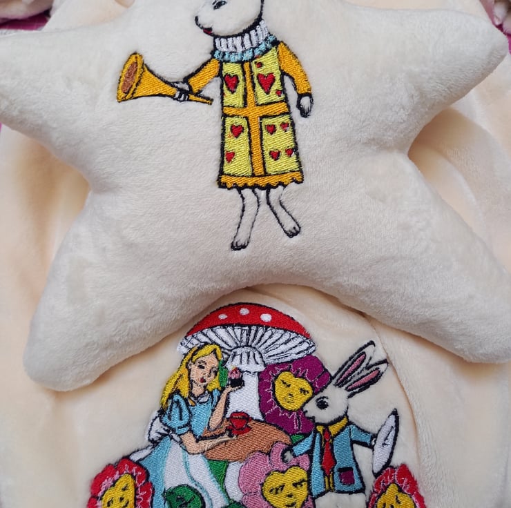 Baby blanket with embroidered Alice in Wonderland. This is a cuddle fleece ivory colour blanket and star pillow set.