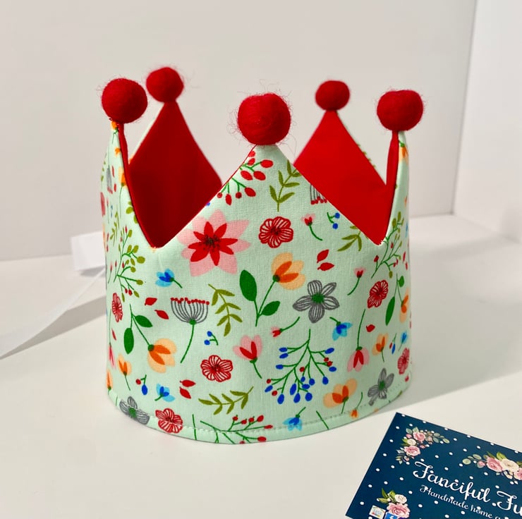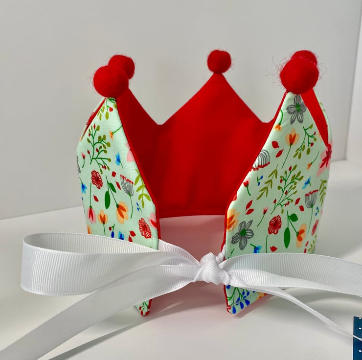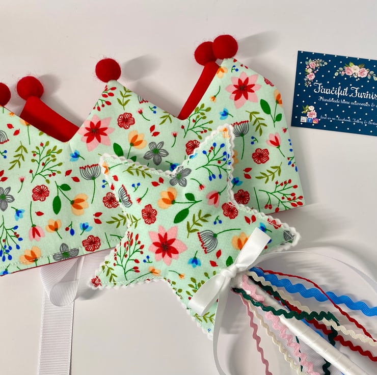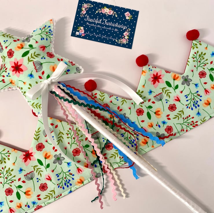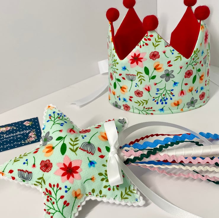 Child’s pretty fabric crown with matching wand. Ideal for dressing up or I can personalise this set with a name or a number if you’d like it for a birthday or party celebration. The crown ties at the back with coordinating ribbon so it will fit a range of head sizes.