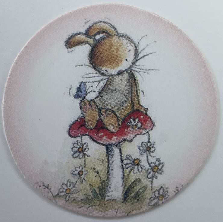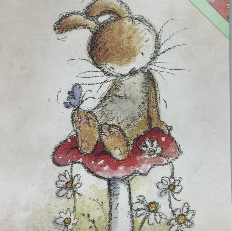 A cute card for a birthday celebration. This A5 card features the cutest bunny sitting on a colourful toadstool. She has a butterfly on her toe which she is watching closely. There are daisies under the toadstool. The card is finished with a matching Happy Birthday greeting and a pretty daisy printed ribbon to the spine. Inside the card has a matching picture of the bunny but no greeting, this is left up to you.
