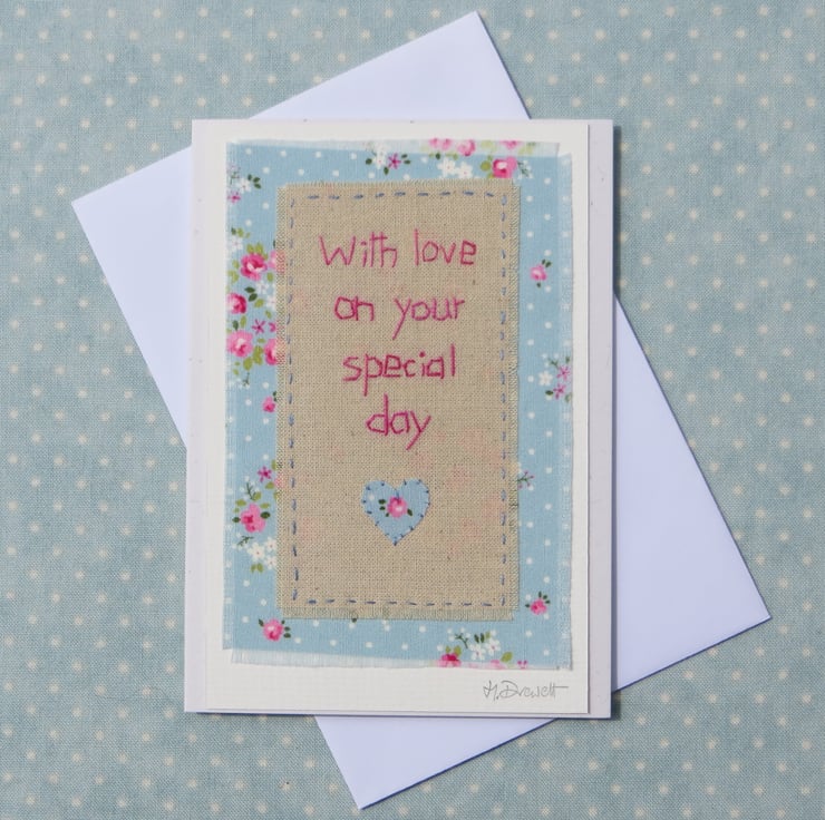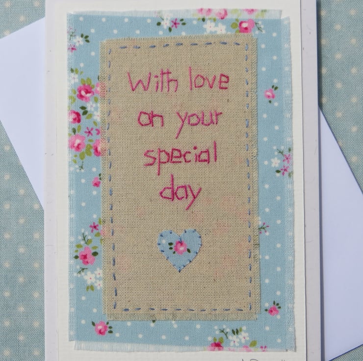 This is a small greeting card featuring an applique heart with hand-stitched words 'With love on your special day'. The central panel is stitched to a pretty cotton fabric. A unique hand-made card to send your love to someone special.....a card to keep.