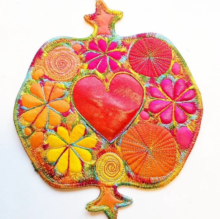 This is a handmade pomegranate hanging decoration. There is a heart shape in the middle.