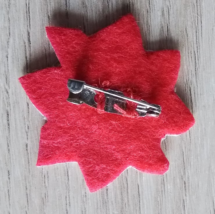 It is backed with coloured felt & has a silver tone brooch pin sewn on the back.