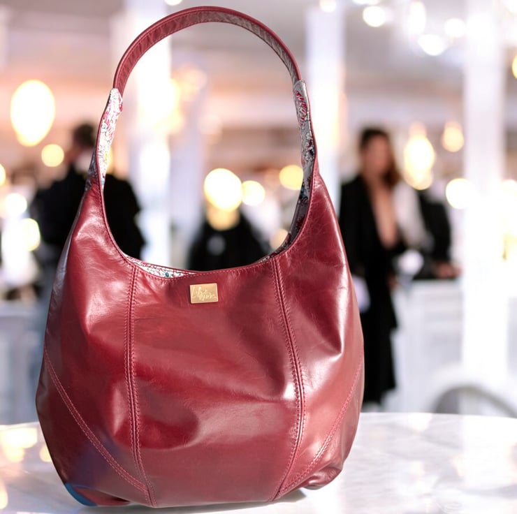 This is Estrella - the tote bag that just... works! Made from rescued burgundy leather, this slouchy beauty is perfect for everyday use. Whether you're grabbing lunch with friends or running errands, it's got the space and style to handle it all.