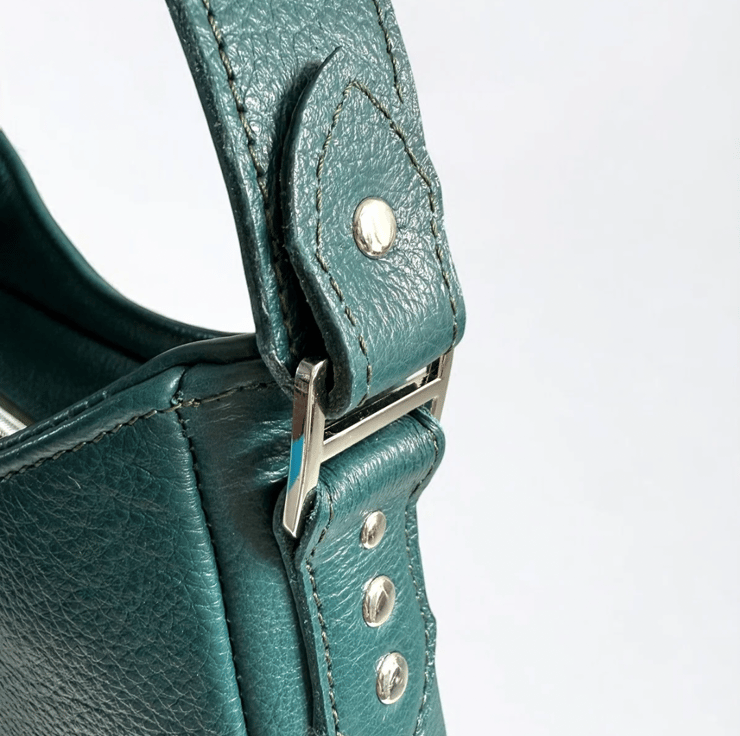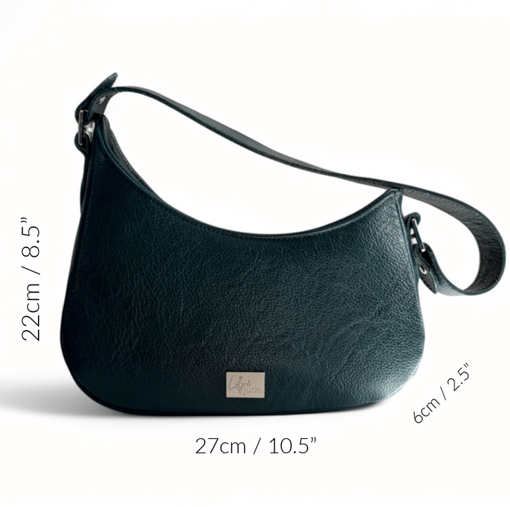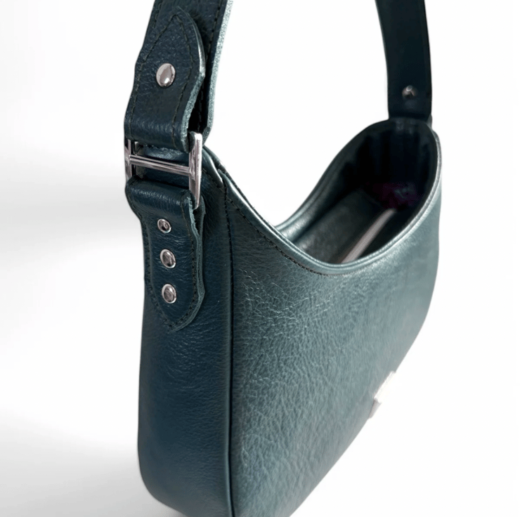 This bag is the perfect mix of style and practicality. Made from rescued dark teal leather, this shoulder bag features sleek, asymmetric lines and just the right amount of space for your essentials. Perfect for days when you're dashing from work to evening plans.