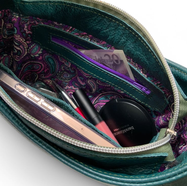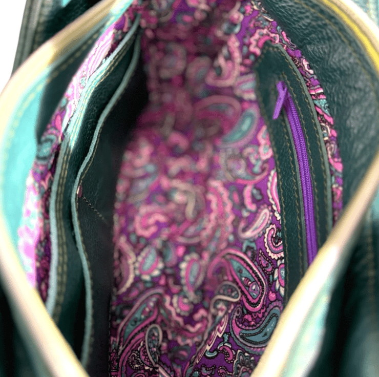 Inside, the lush purple and teal paisley lining adds a touch of fun. The fixed strap fits snugly under your arm, making it comfortable and easy to carry. Clever interior pockets keep your essentials organised, while the secure zipper closure ensures everything stays in place.