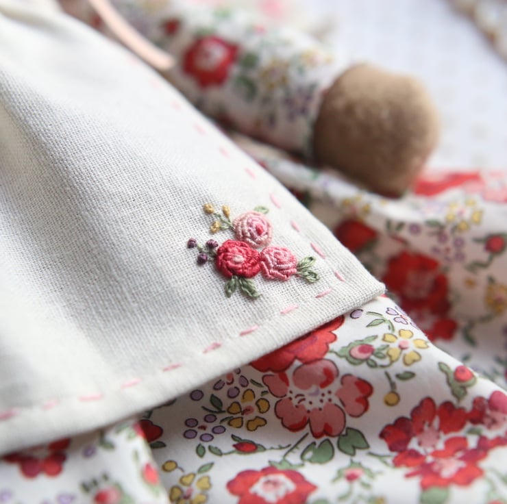 Her apron is made from cotton/linen fabric and embroidered with tiny running stitches and a little sprig of flowers.